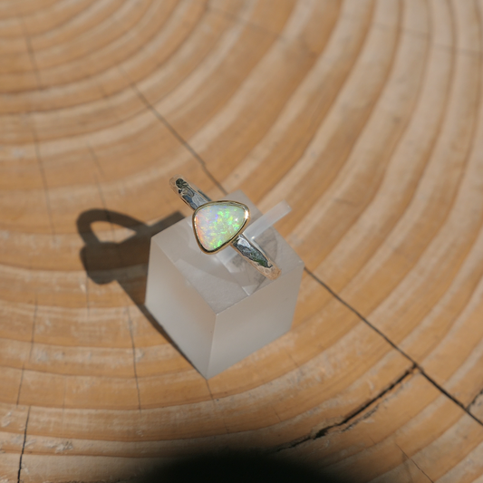 Lightning Ridge crystal opal ring, silver with an 18k gold bezel size N