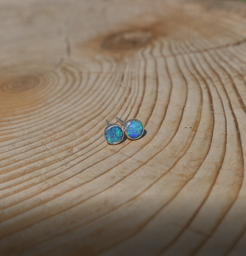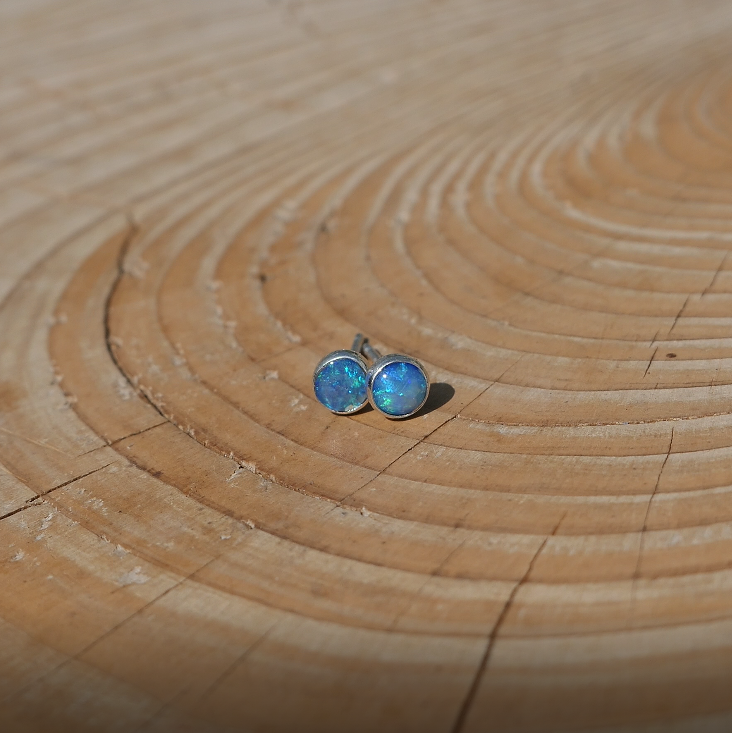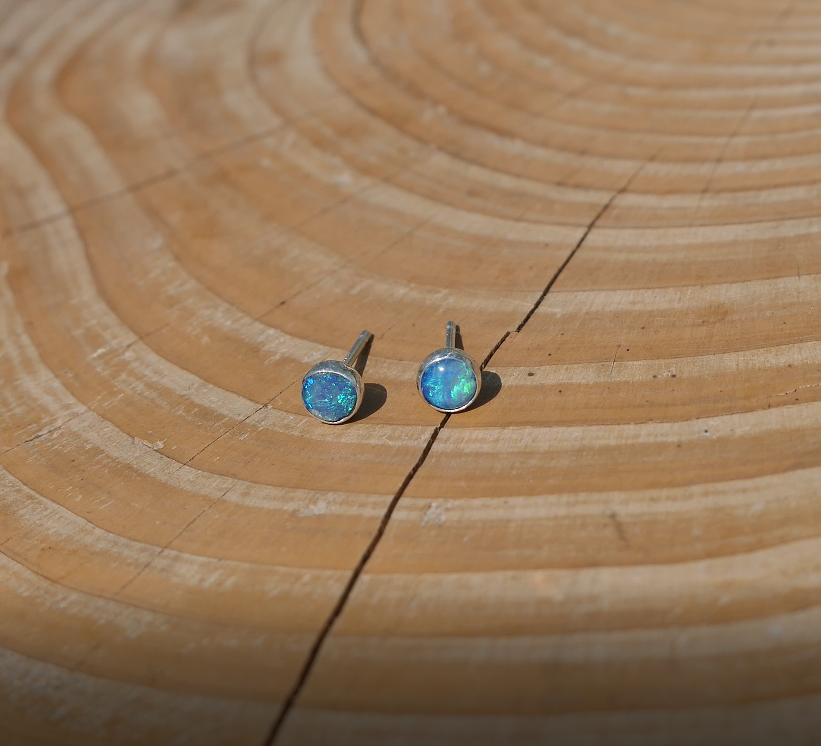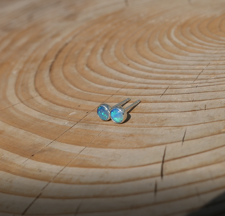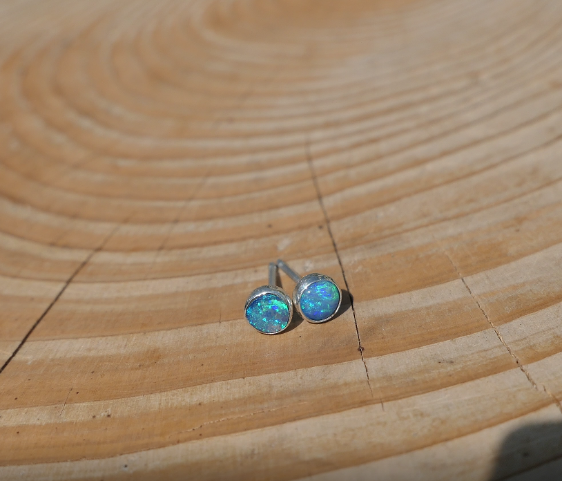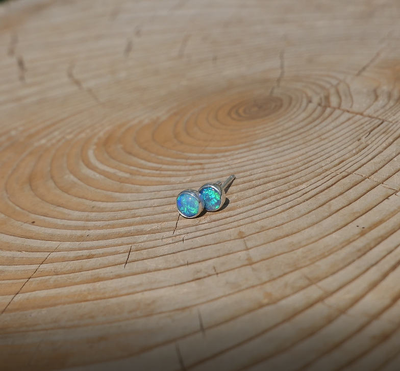 4mm silver earstuds with vibrant, bright green and blue Lightning Ridge opals.