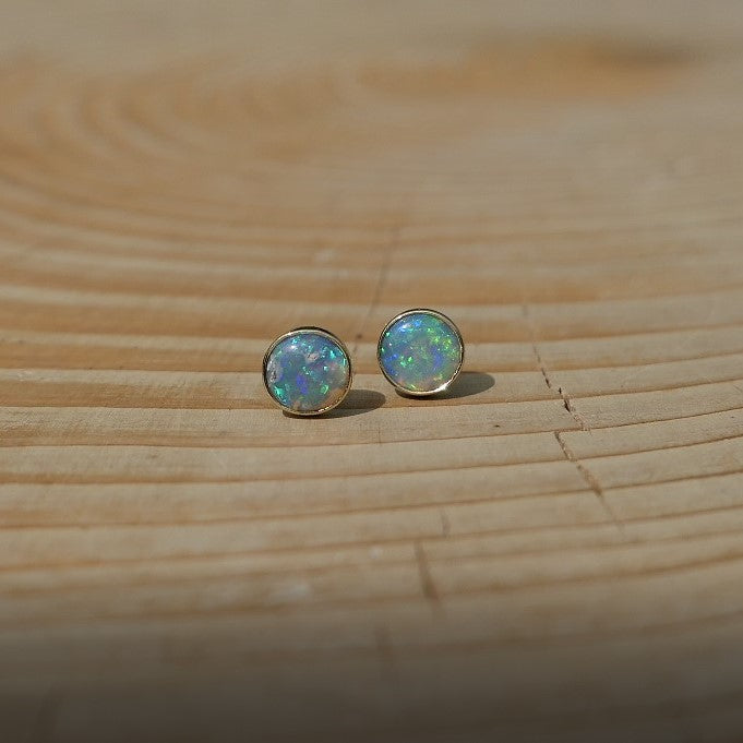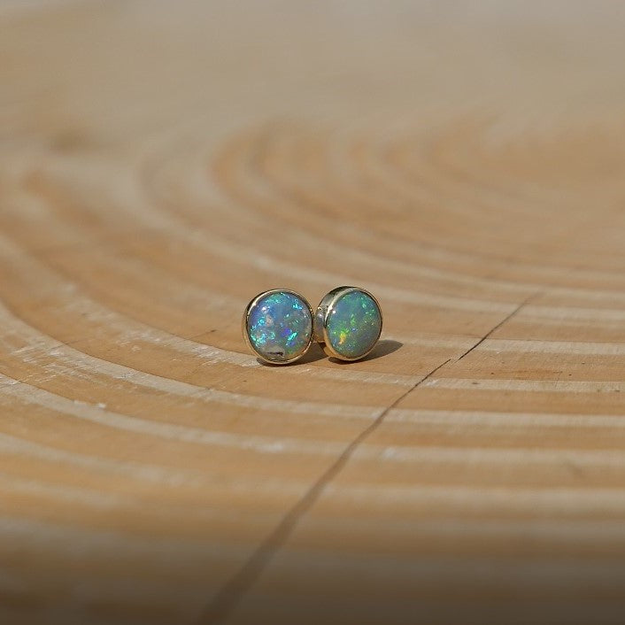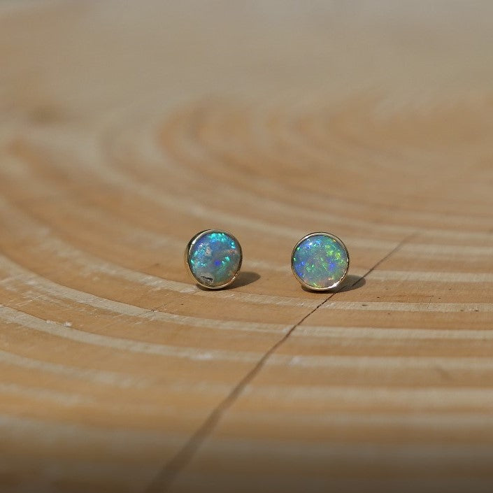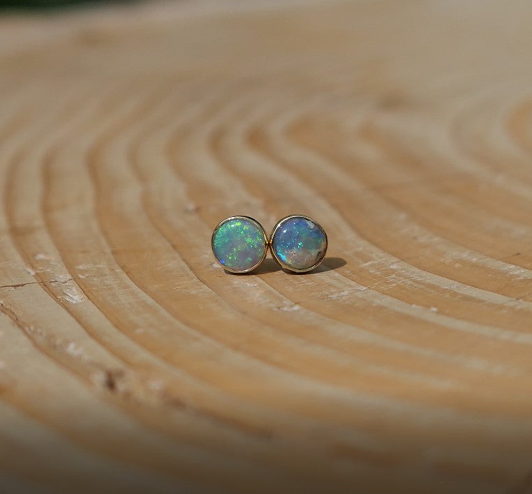 5mm 18k gold opal earstuds with bright green and blue opals from Lightning Ridge.