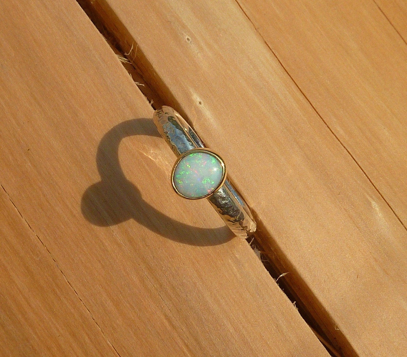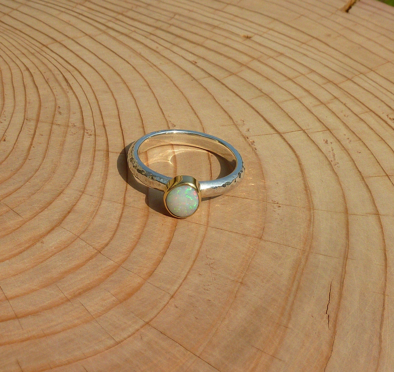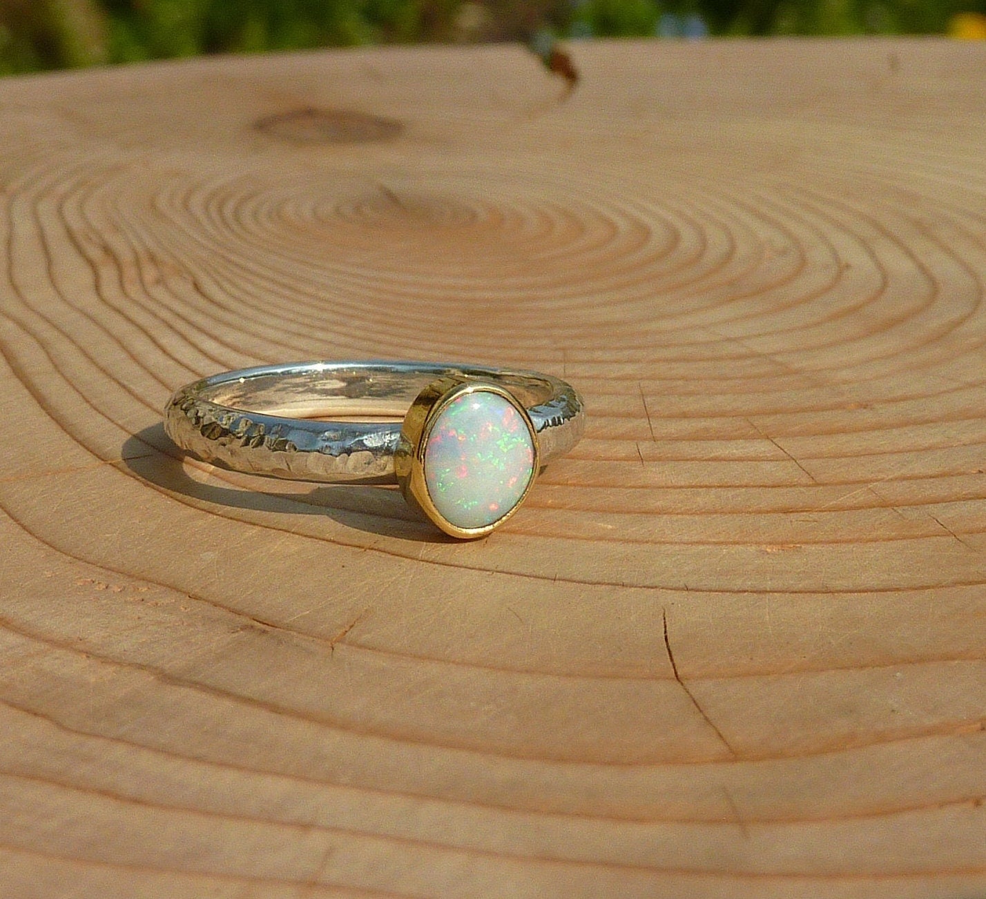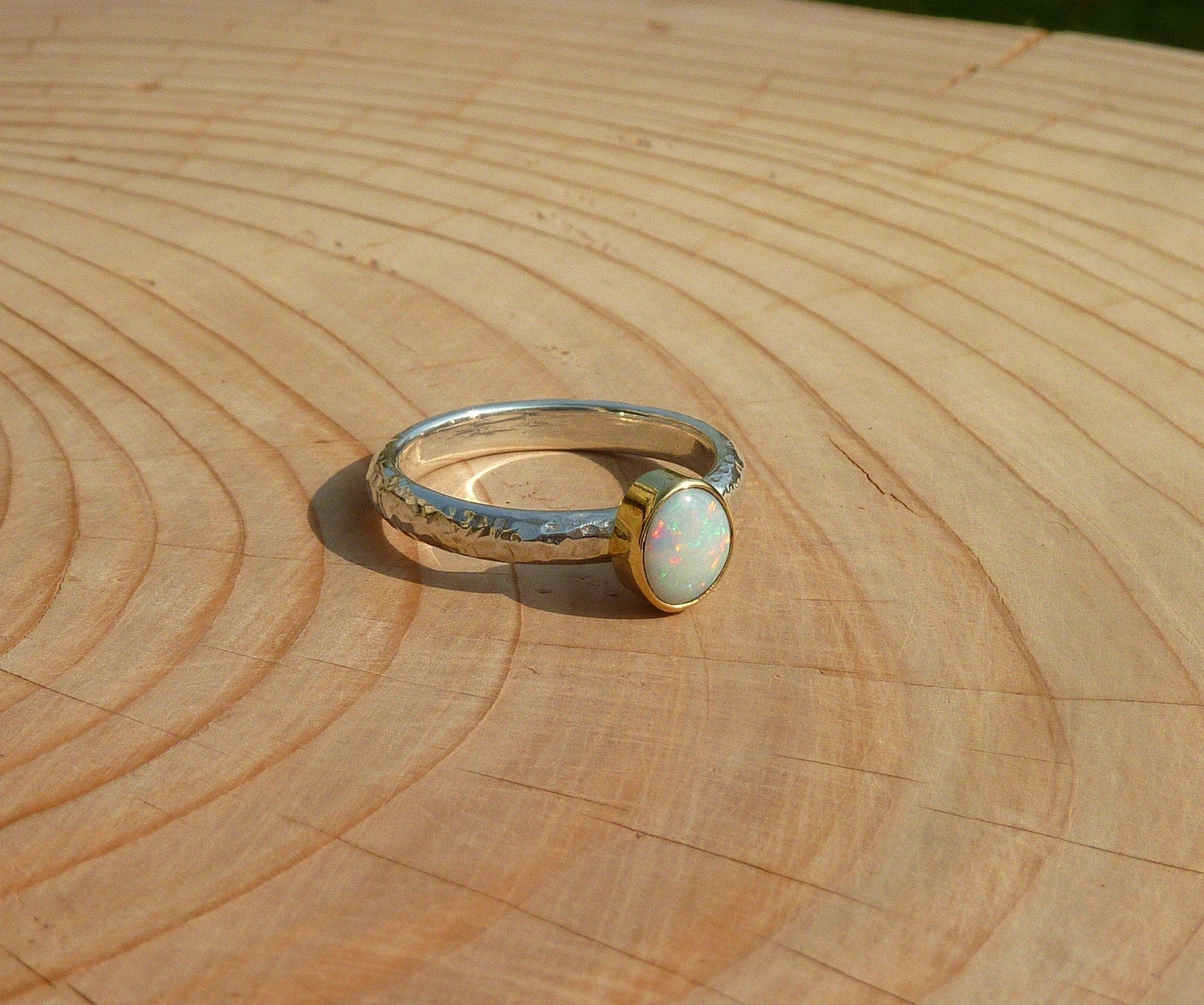 Rounded opal that looks white initially, then reveals red pinfire, with green and blue. The opal is raised slightly from the gold bezel mount. Looking different in the different situations you’ll find yourself in. A ring that will suit anything you are wearing. This opal is a truly uplifting gem to glance at, whatever you happen to be doing, stop for a moment and gaze into the opal, enter another universe, perhaps even just find yourself in another aspect of our own universe and immerse yourself in possibilities!
