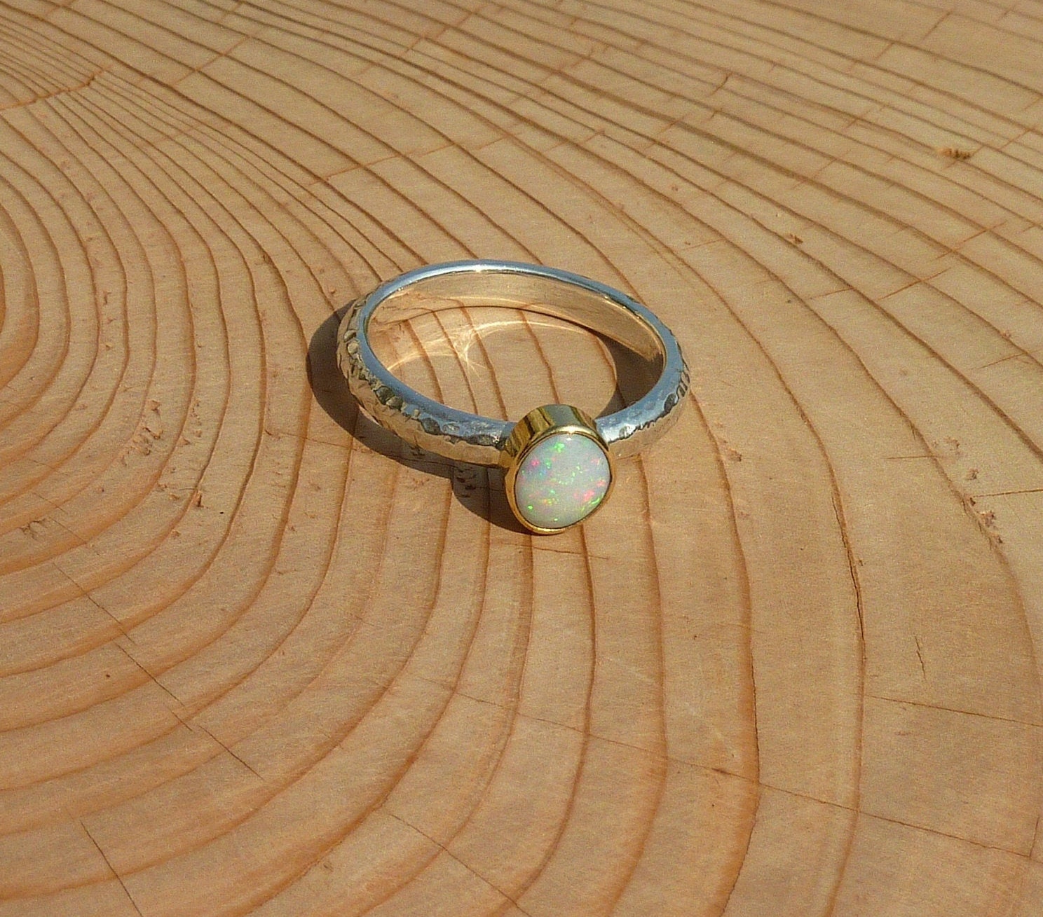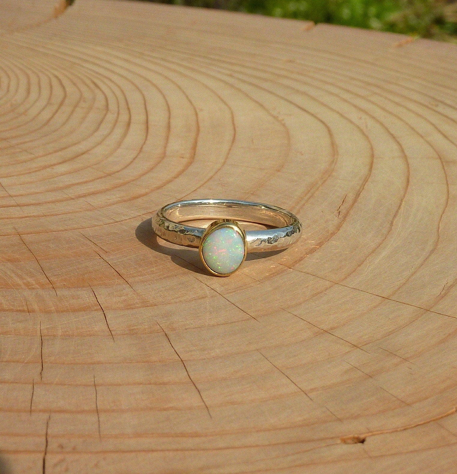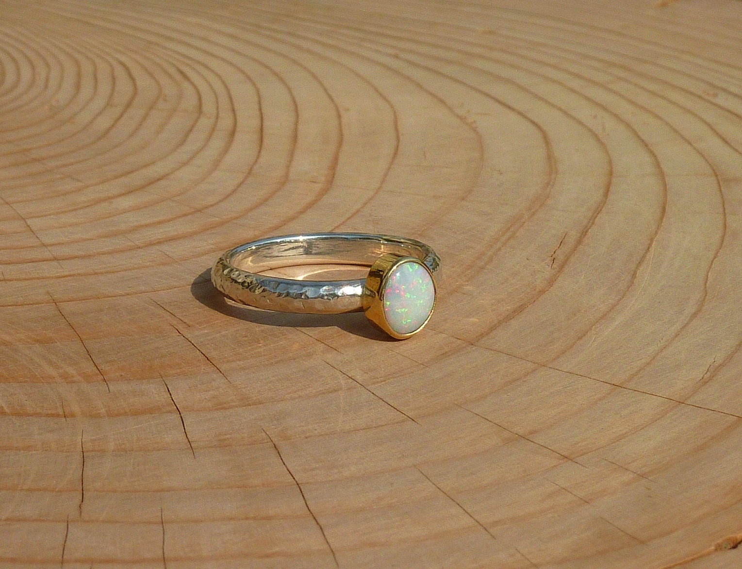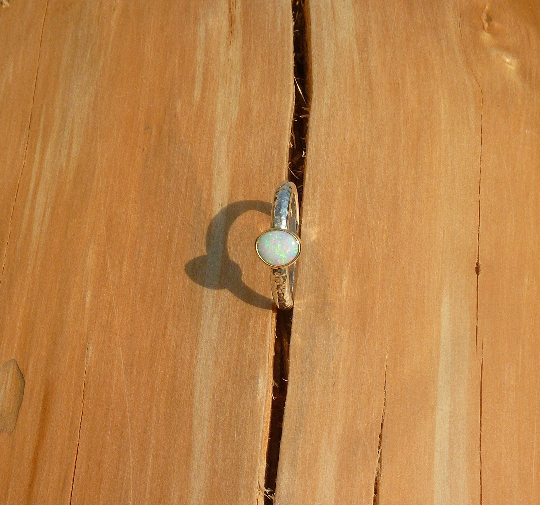 Rounded opal that looks white initially, then reveals red pinfire, with green and blue. The opal is raised slightly from the gold bezel mount. Looking different in the different situations you’ll find yourself in. A ring that will suit anything you are wearing. This opal is a truly uplifting gem to glance at, whatever you happen to be doing, stop for a moment and gaze into the opal, enter another universe, perhaps even just find yourself in another aspect of our own universe and immerse yourself in possibilities!