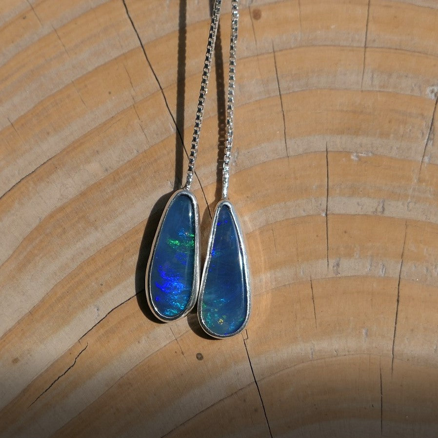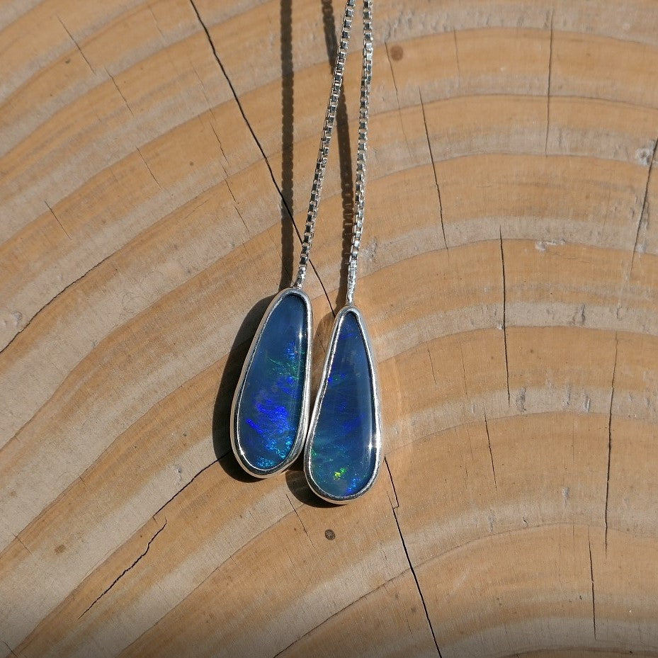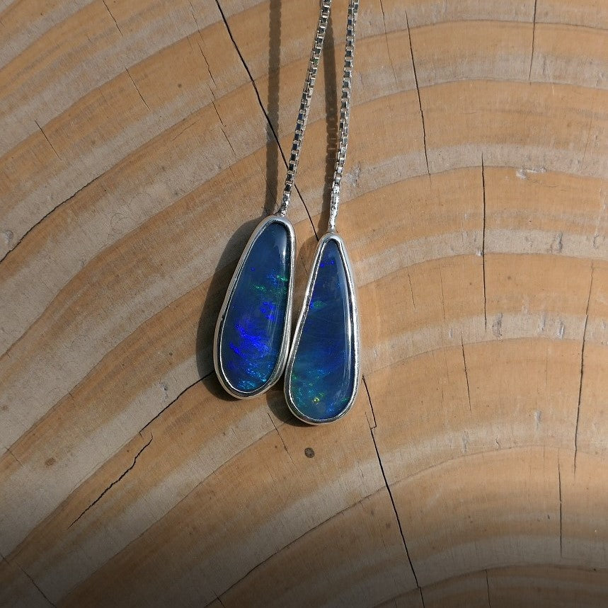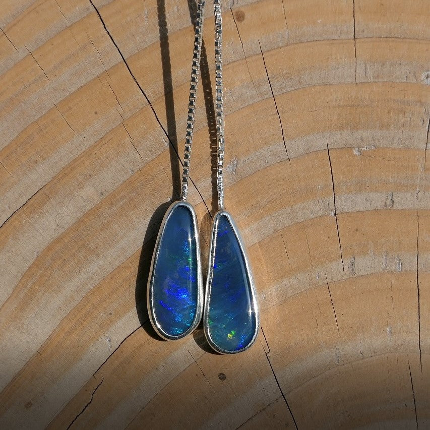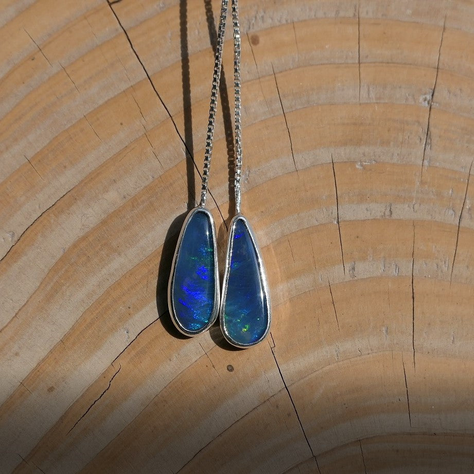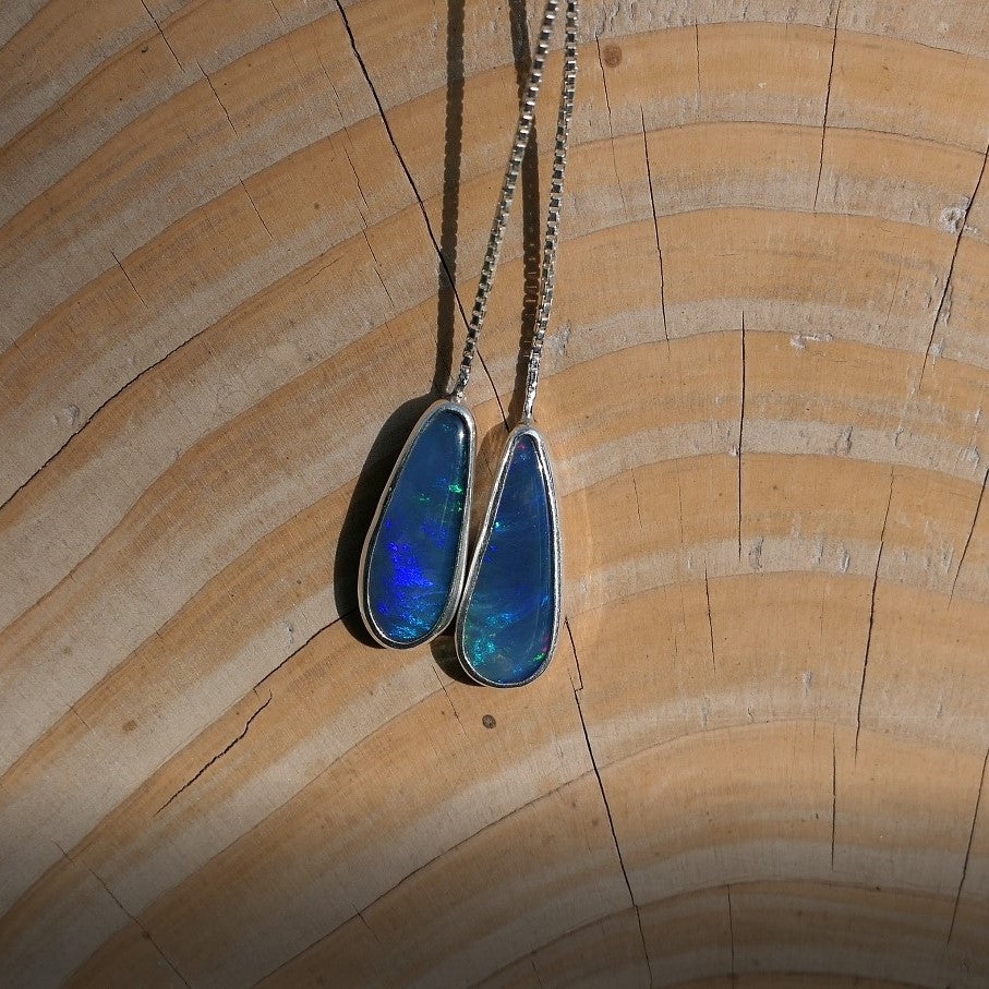 Unique one-off pieces, opals are predominantly blue with green, red flashes showing with any movement.
