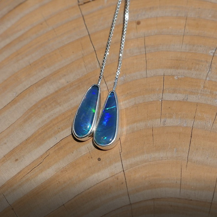 Dangle and drop silver earrings with 2 bright multicoloured Andamooka opals.