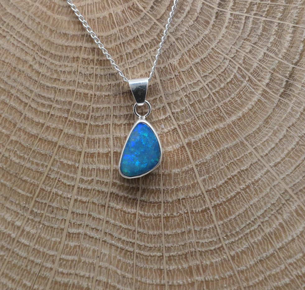 Opal is 11x8mm approx, pendant 16x8mm, and has bright blue and green pinfire.