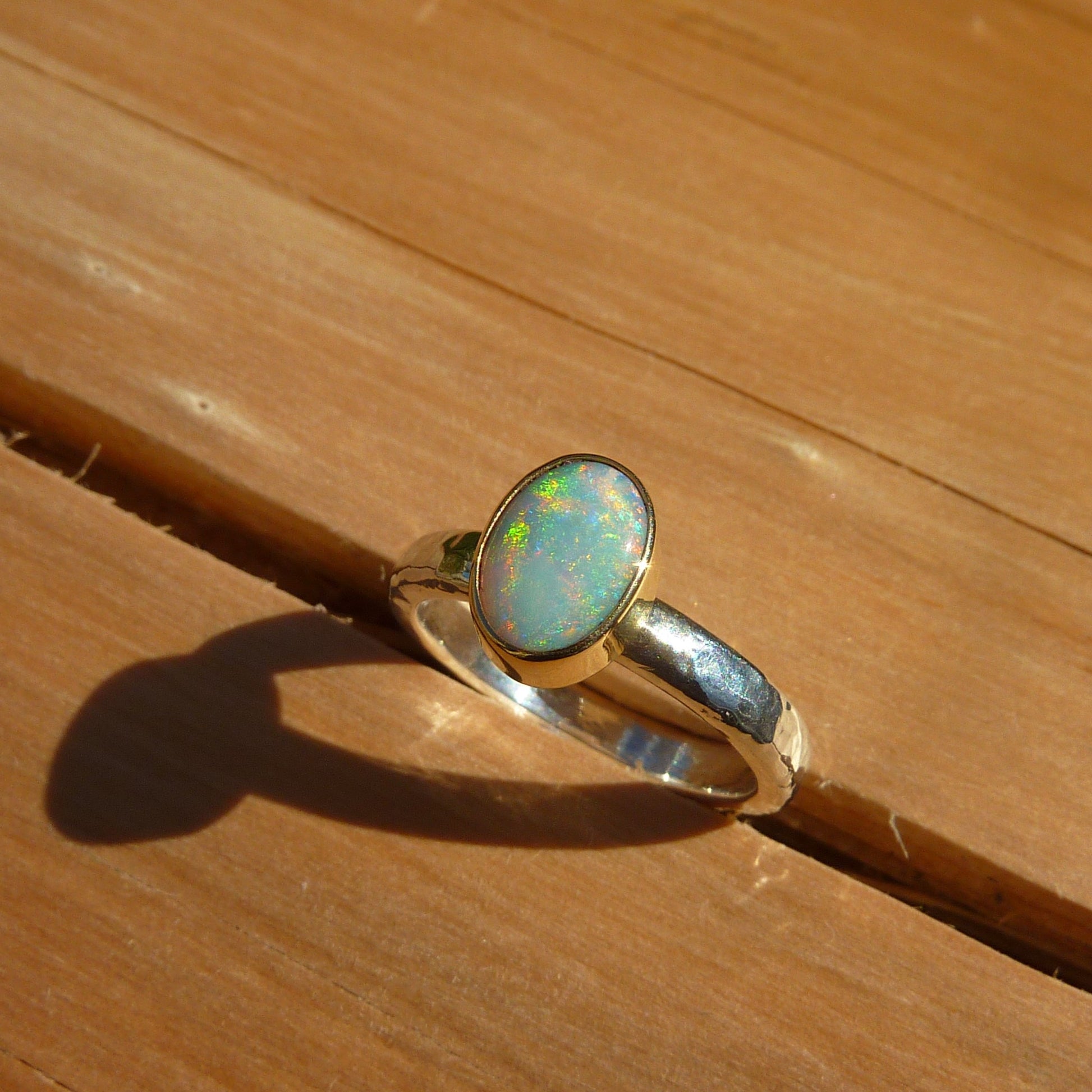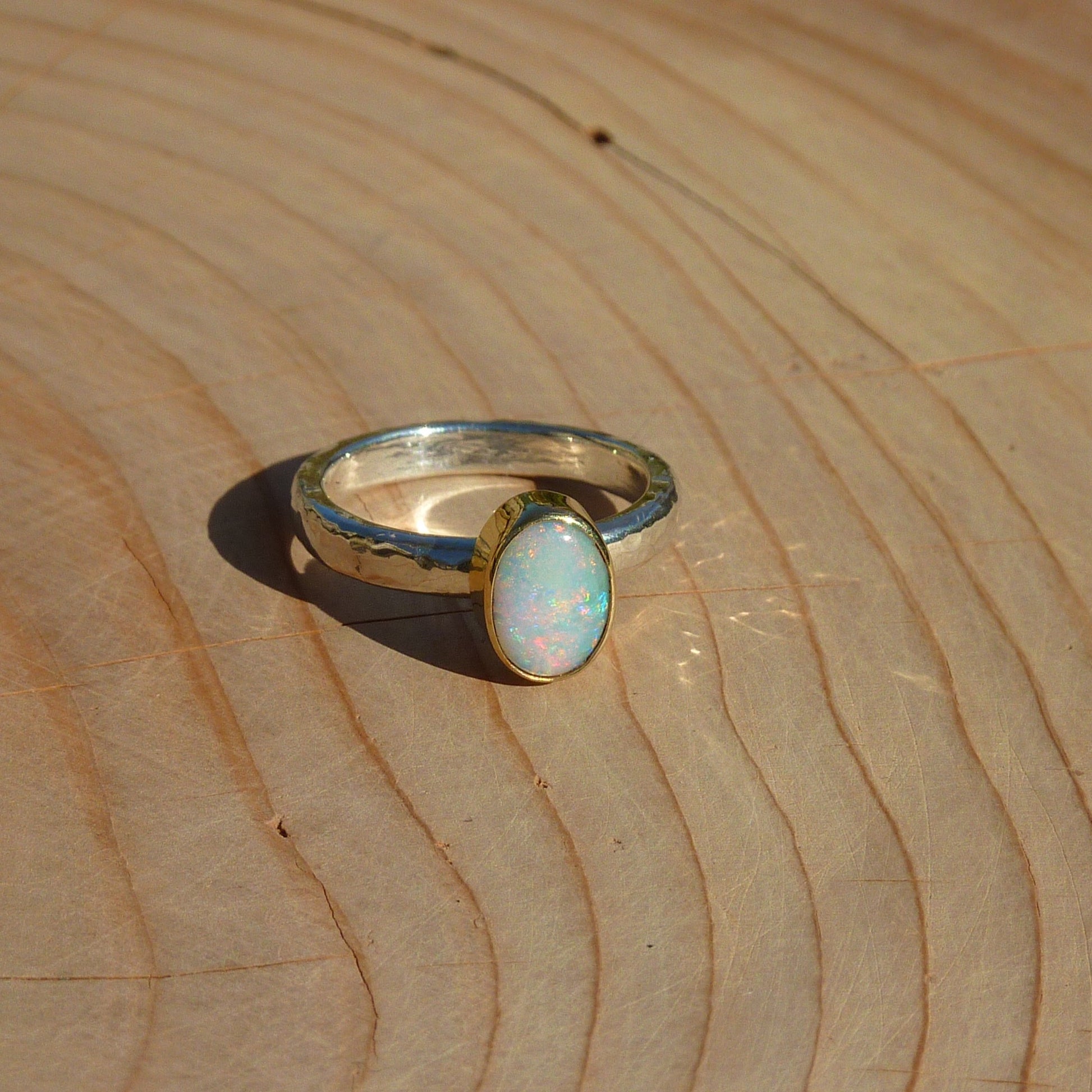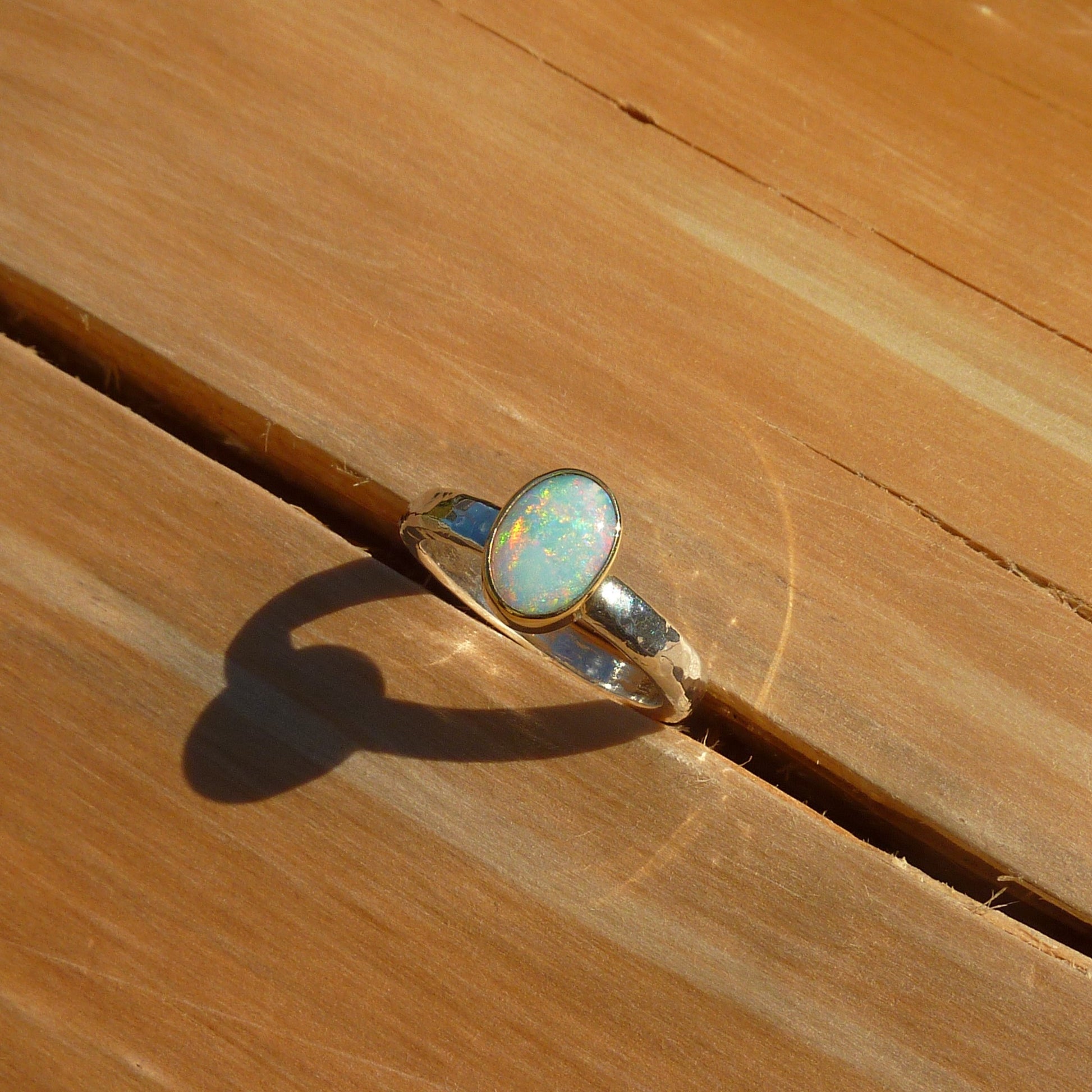 Dainty silver opal ring with 18k gold bezel size J