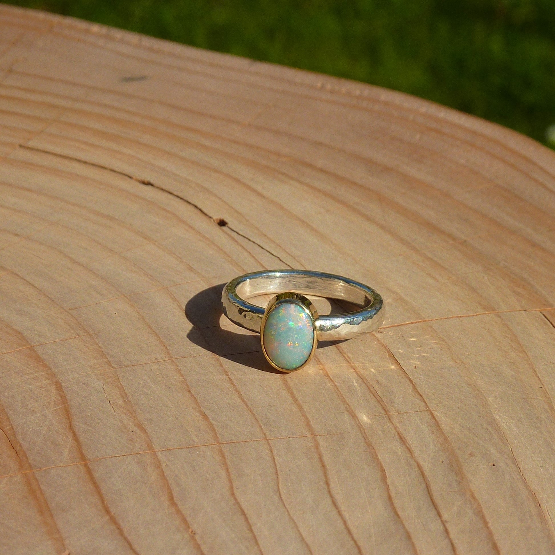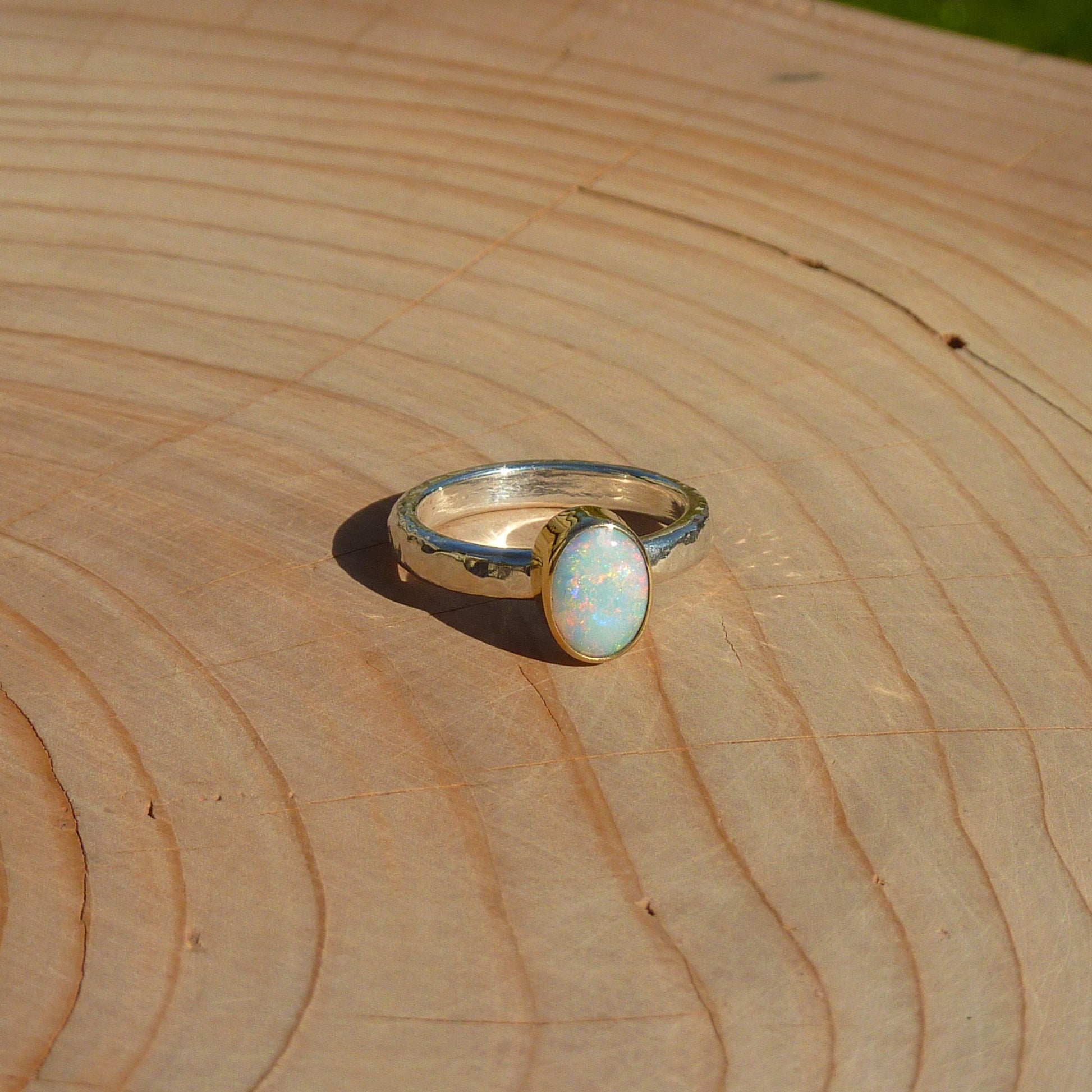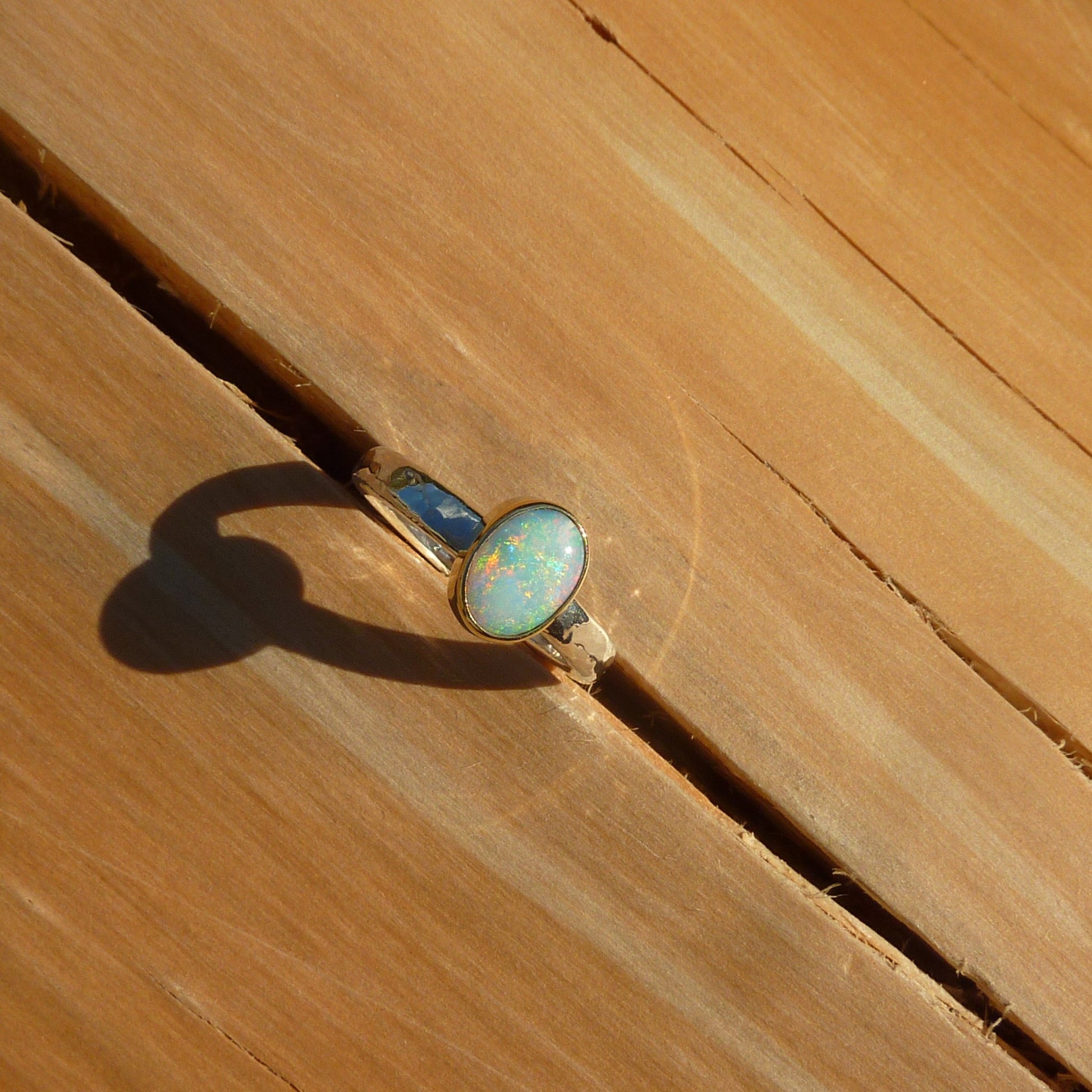 Dainty silver opal ring with 18k gold bezel size J