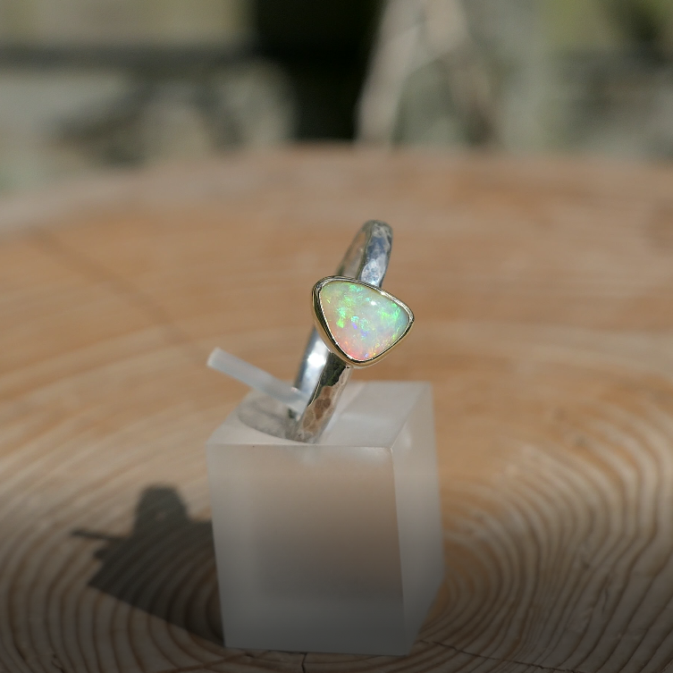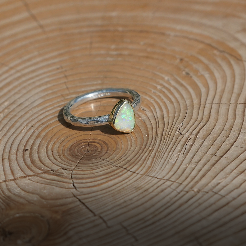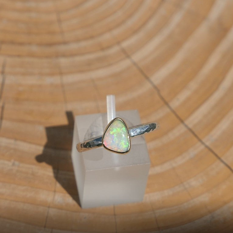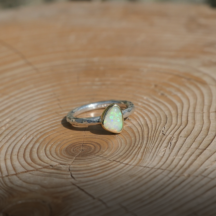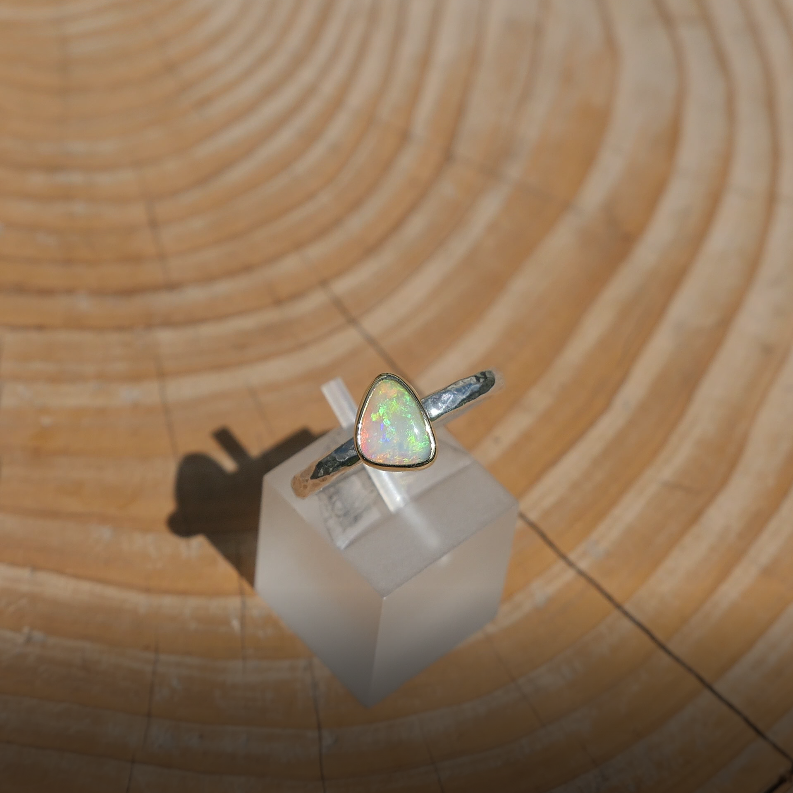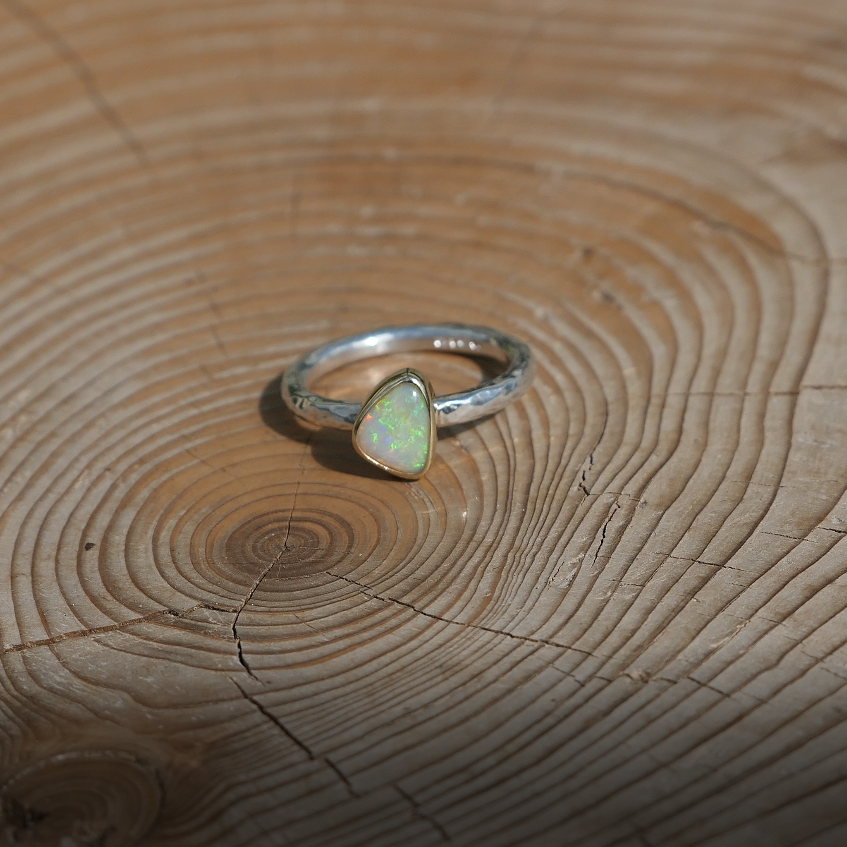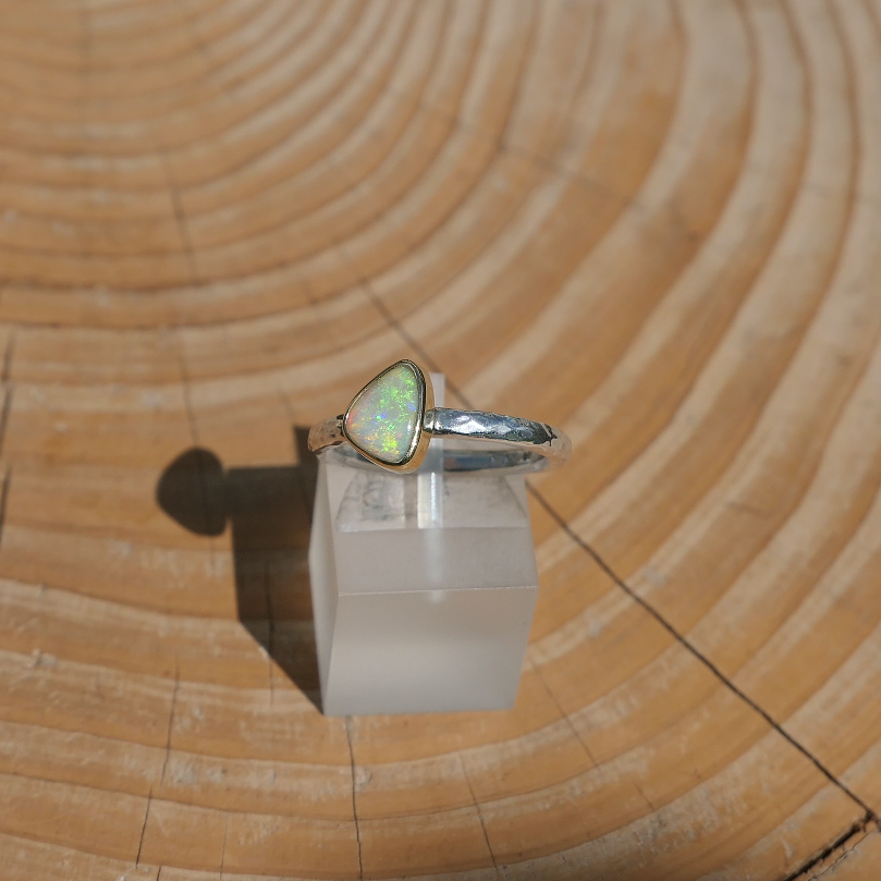 Lightning Ridge crystal opal ring, silver with an 18k gold bezel size N