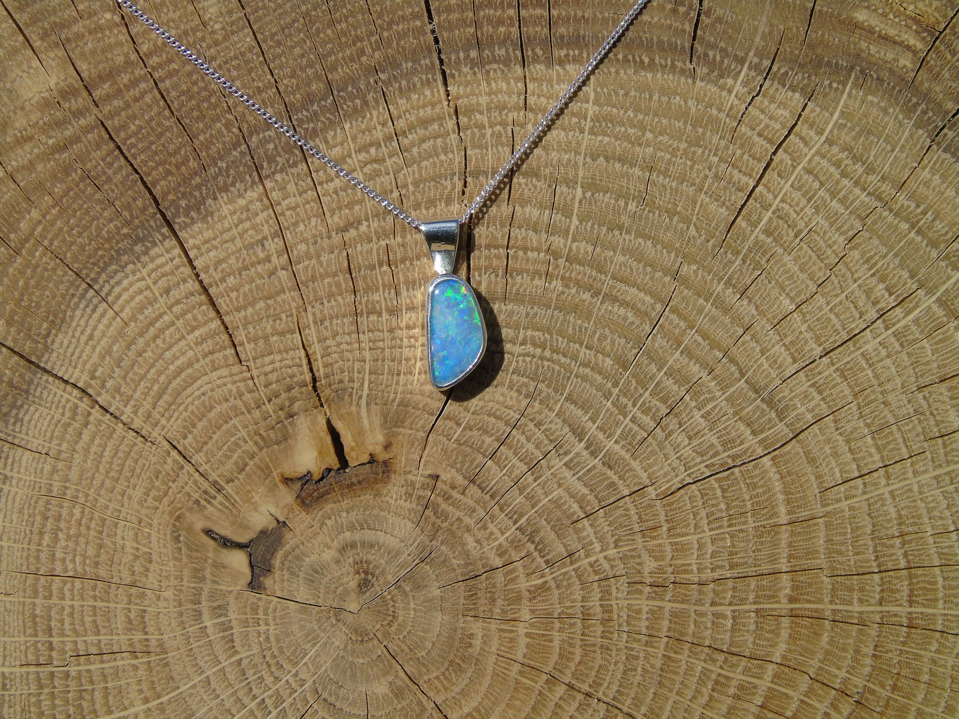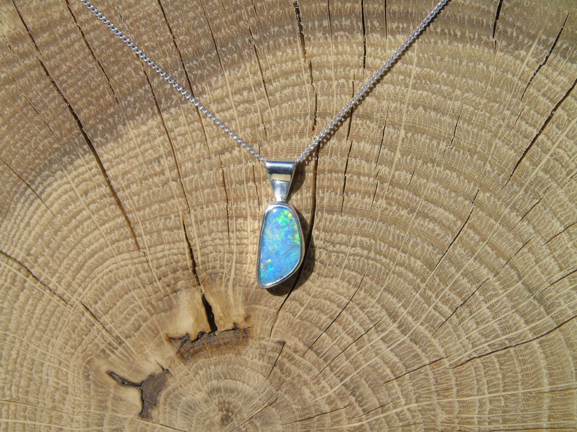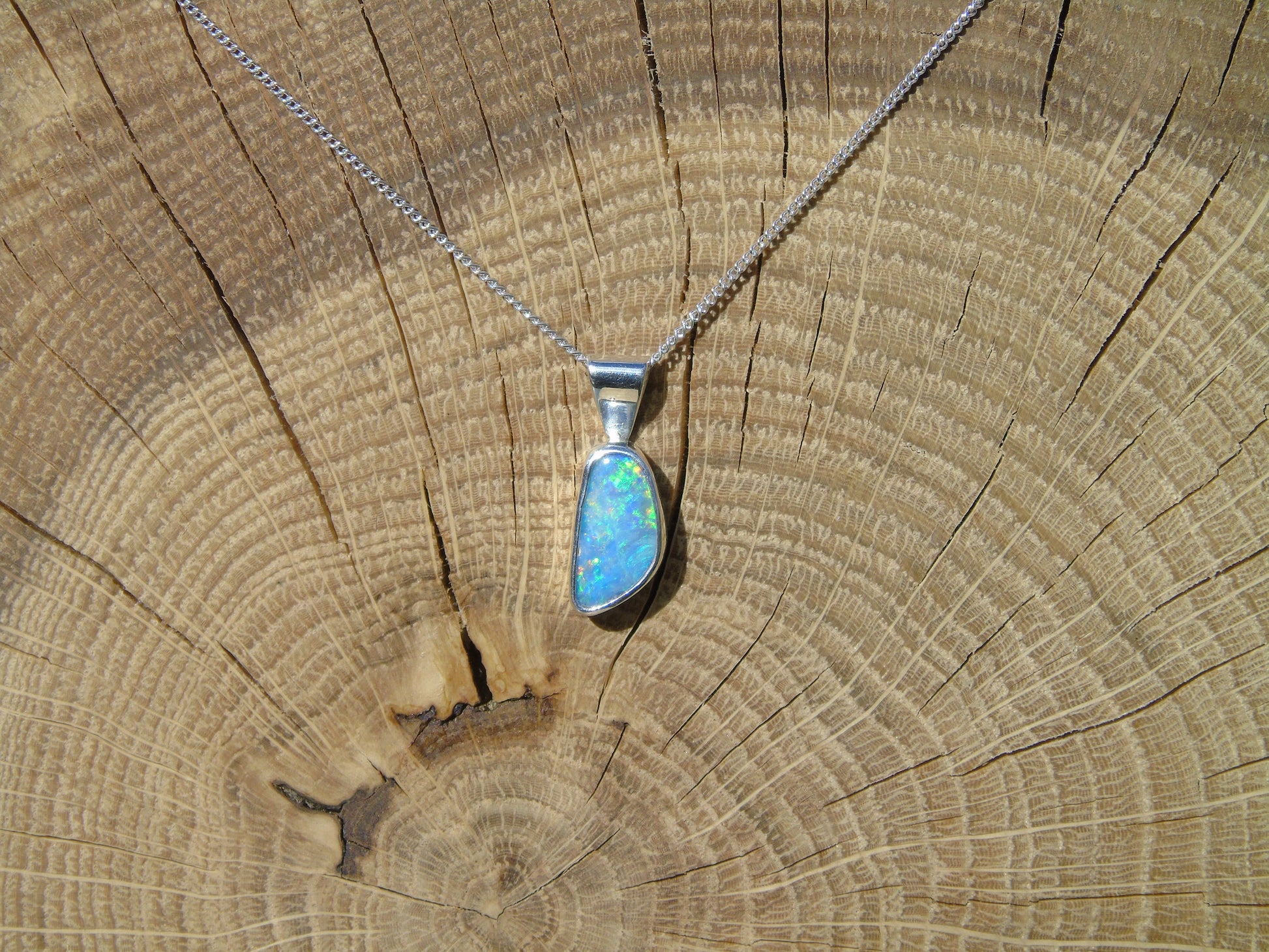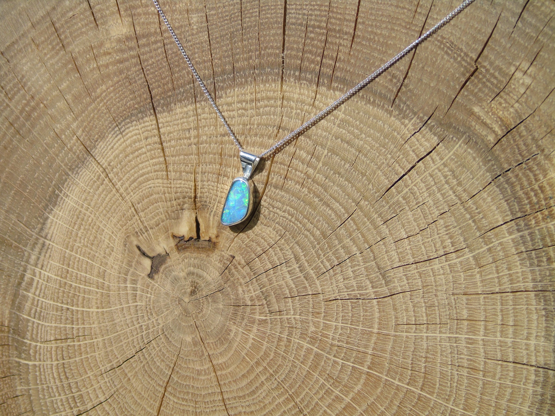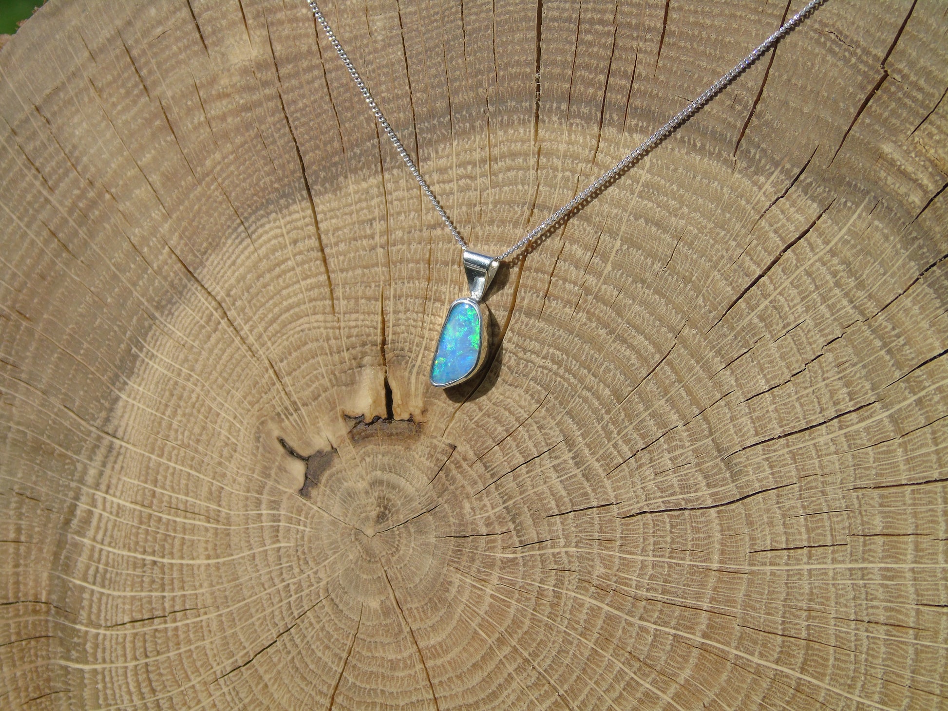 Pendant measures 18x7mm overall, opal 12x6mm.