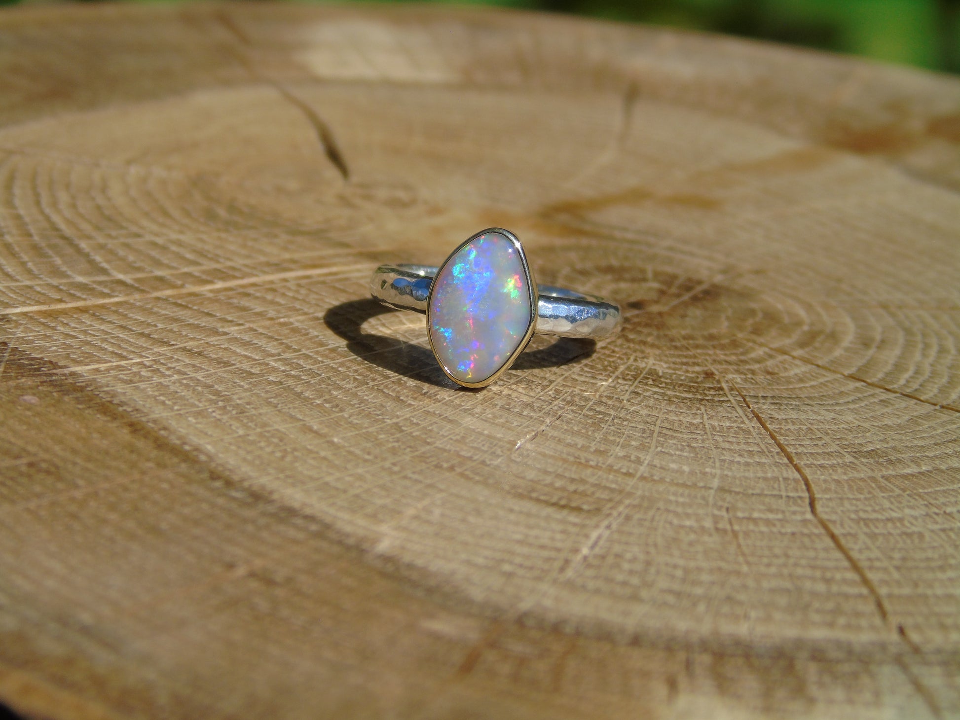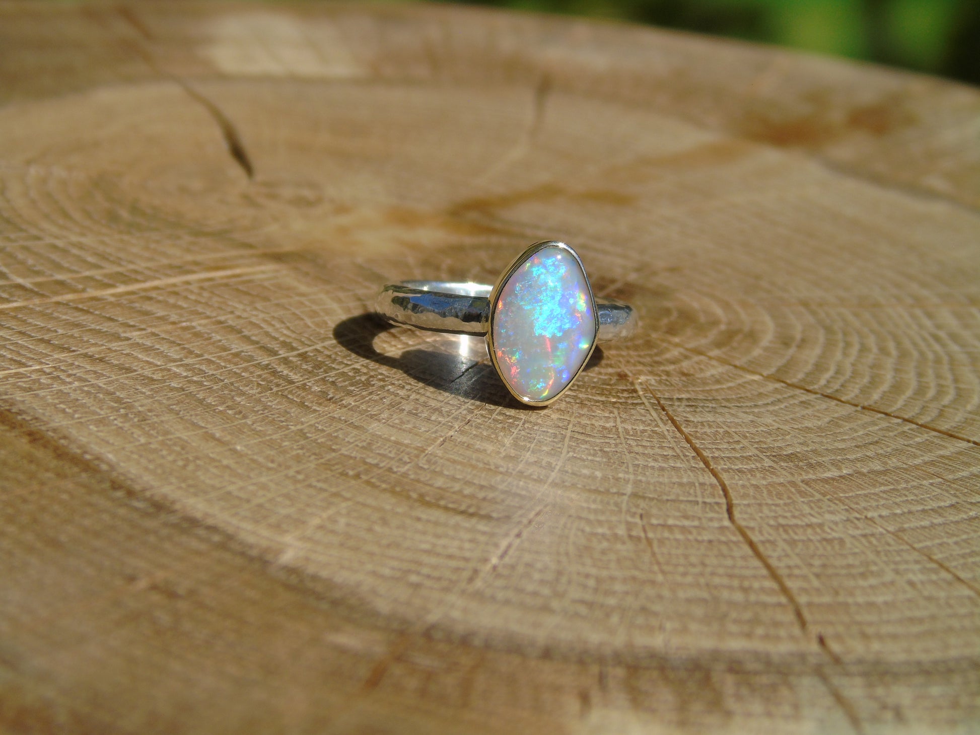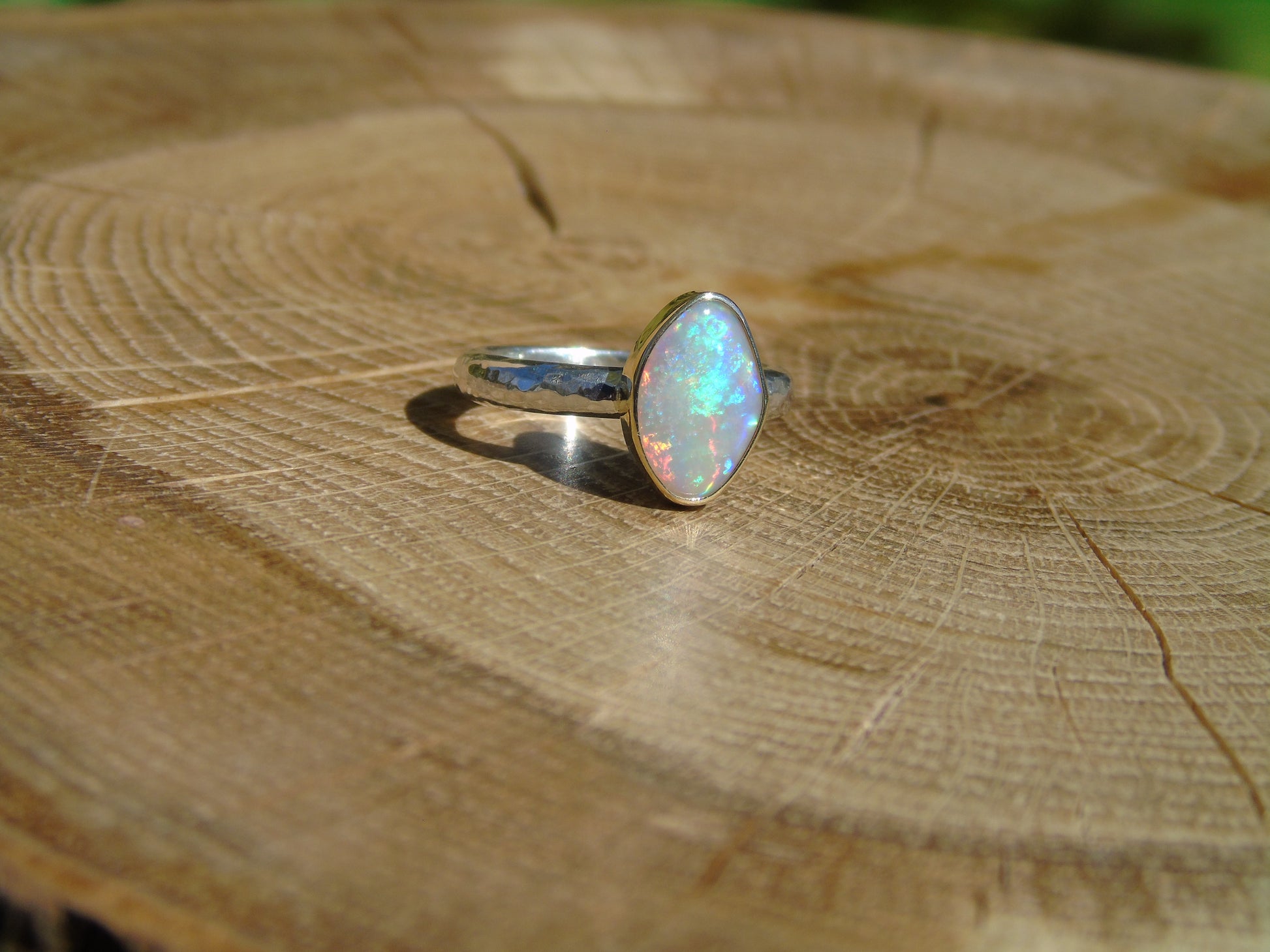 Lightning Ridge crystal opal ring, with an 18k gold bezel. Ring is size L UK/AUS 5.75 US, with a lightly hammered band.