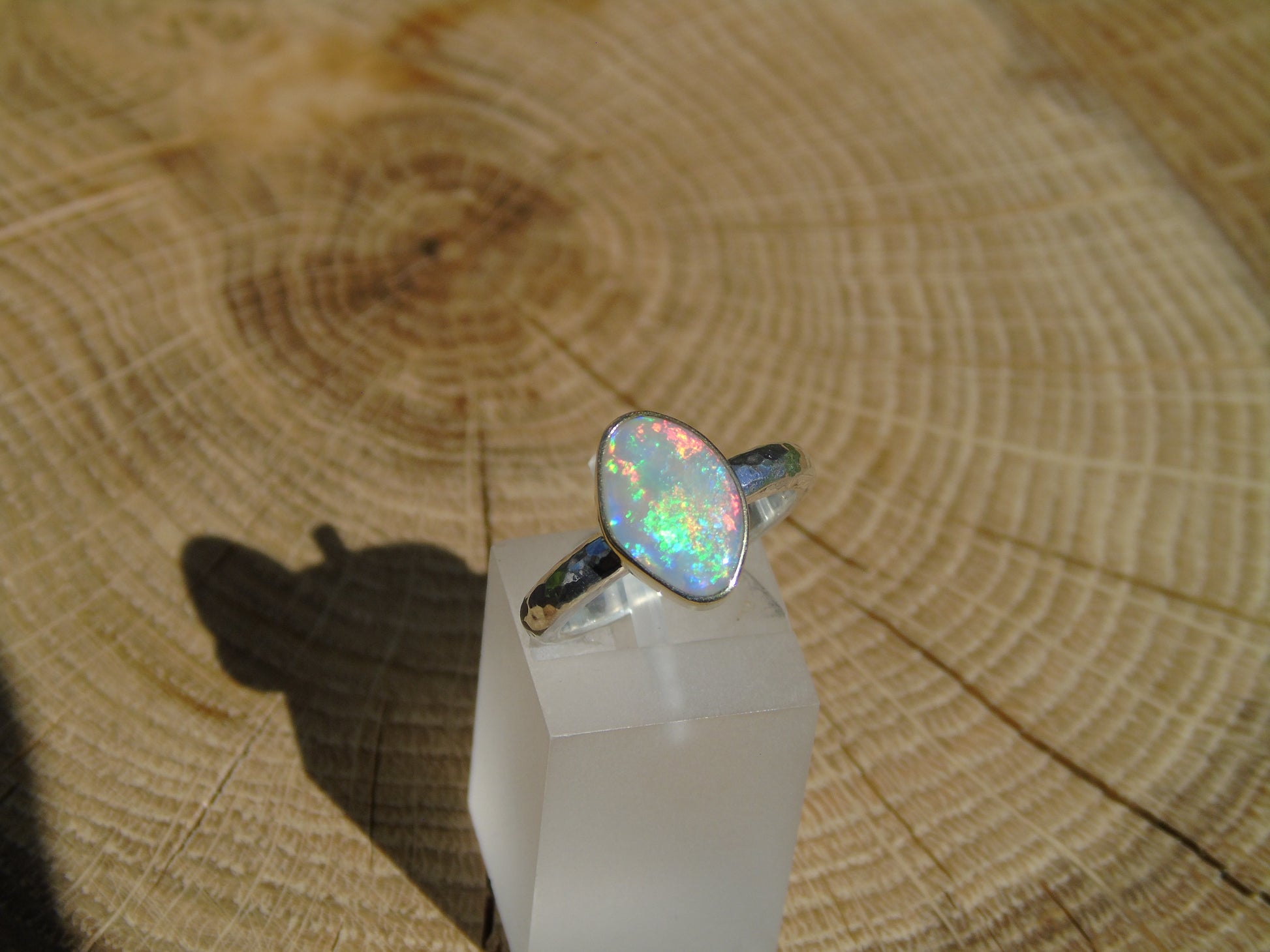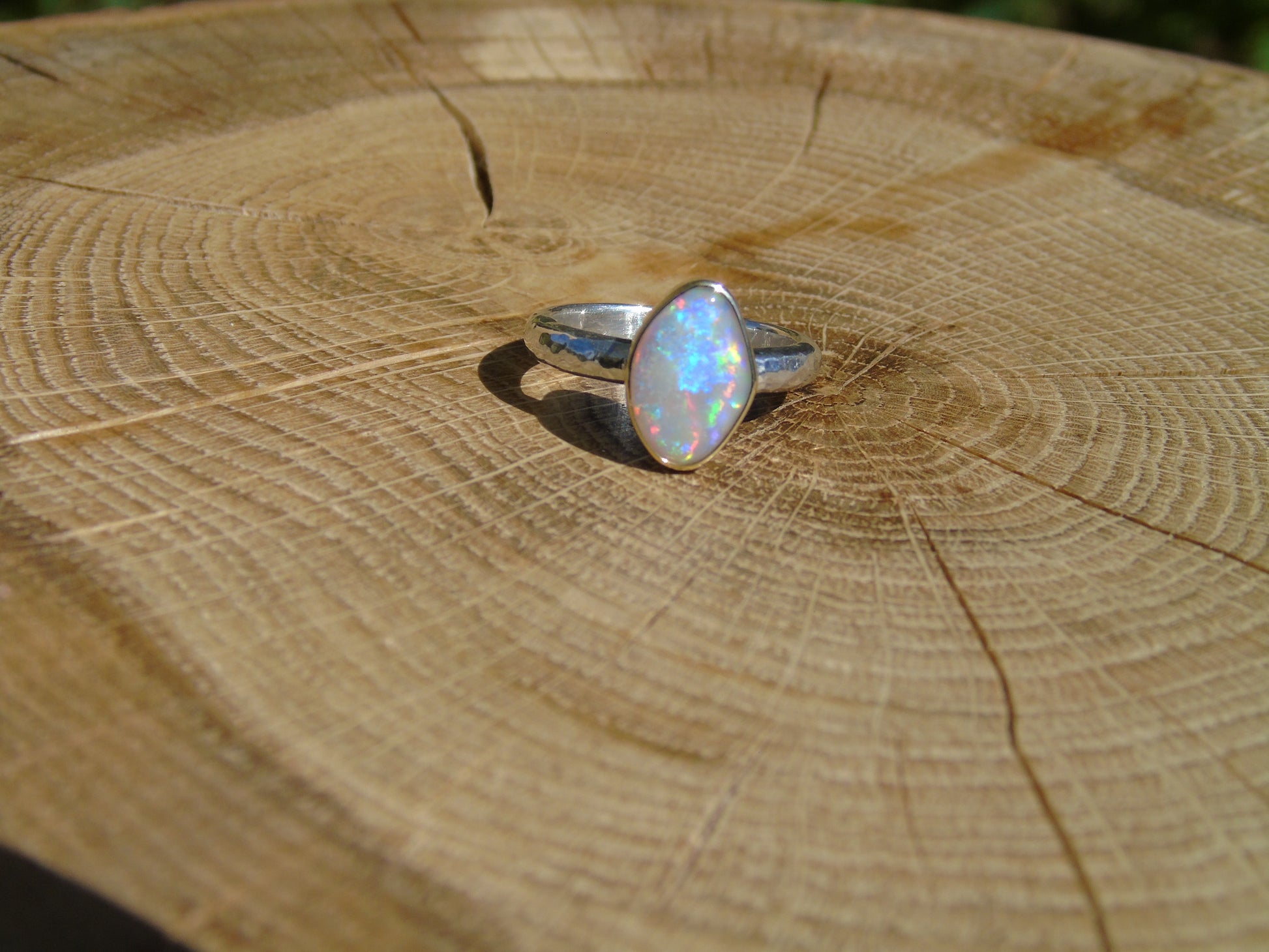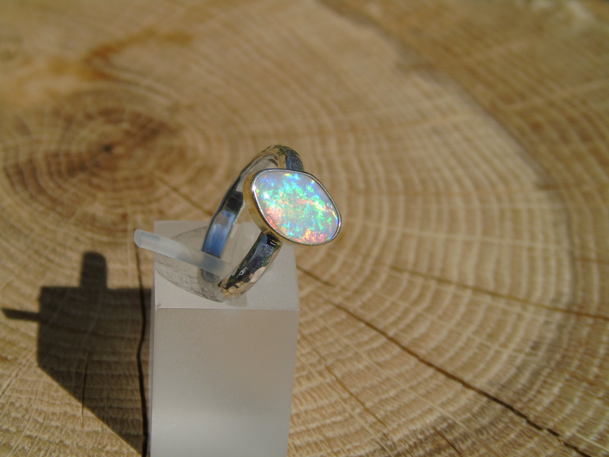 Lightning Ridge crystal opal ring, with an 18k gold bezel. Ring is size L UK/AUS 5.75 US, with a lightly hammered band.