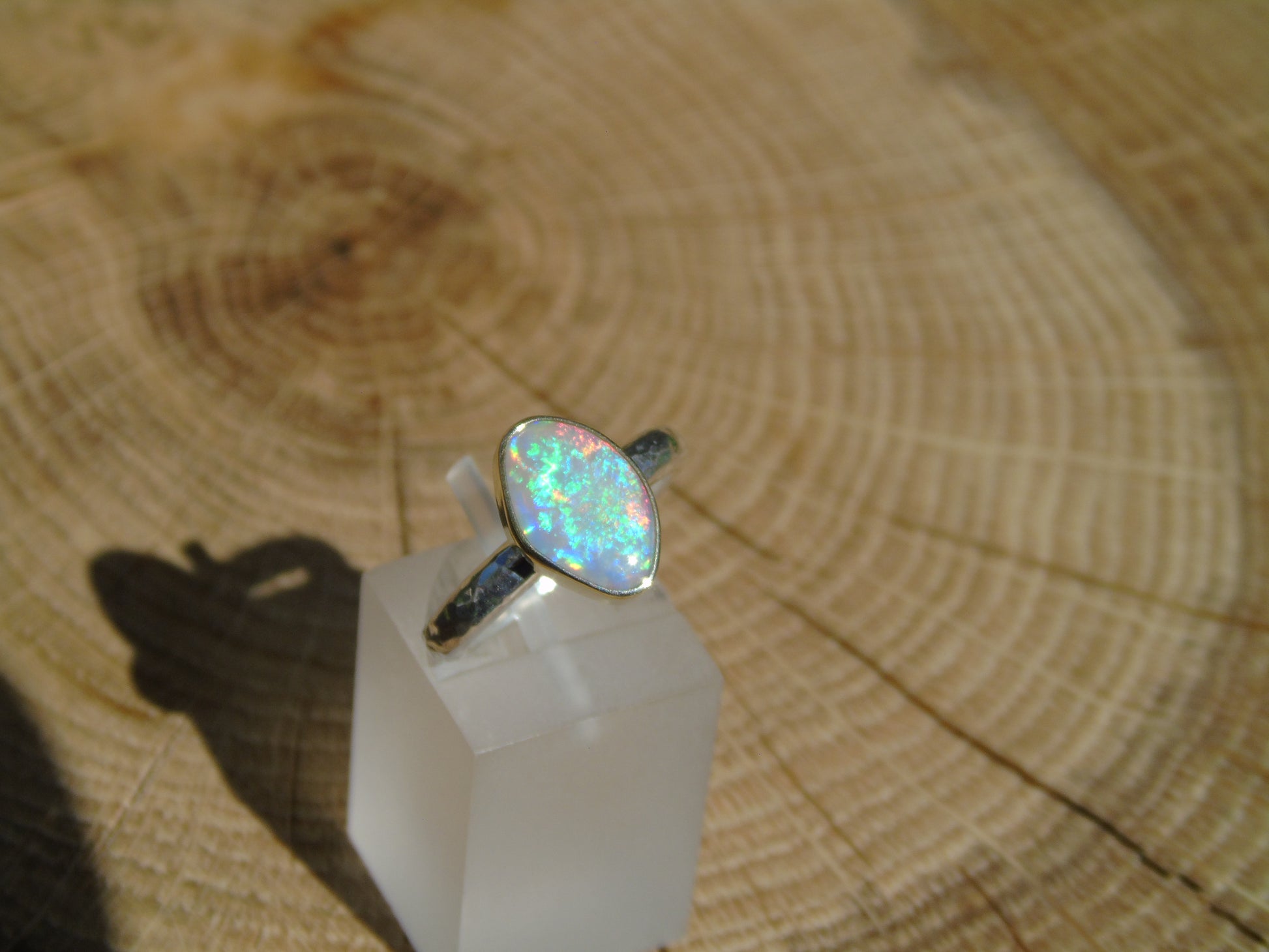 Lightning Ridge opal ring with 18k gold bezel size L