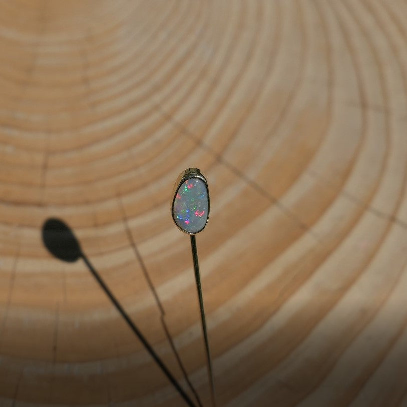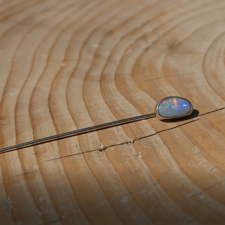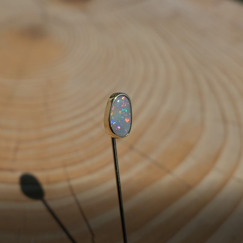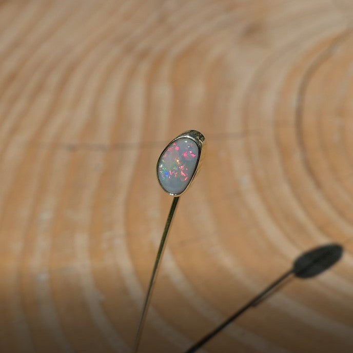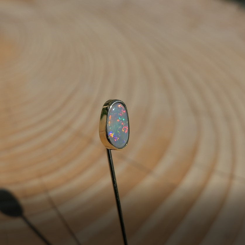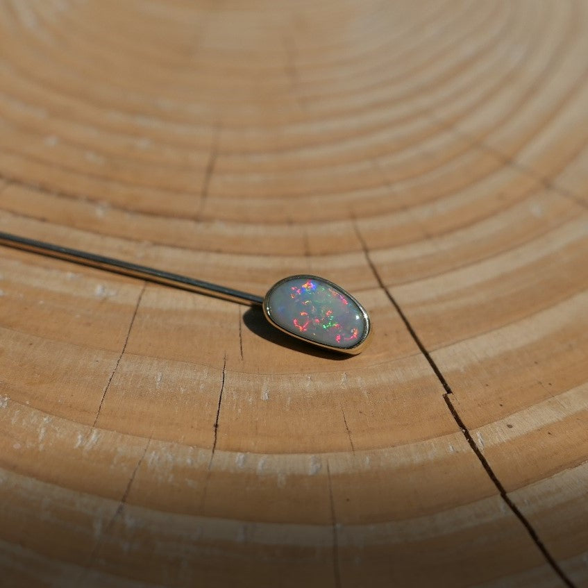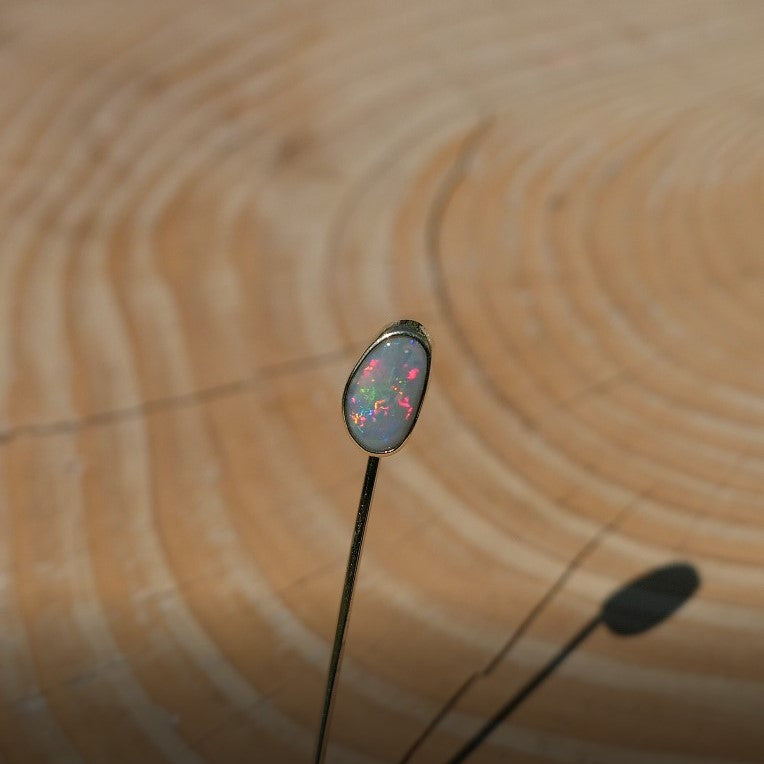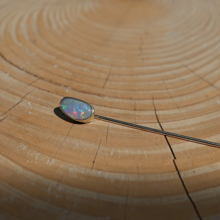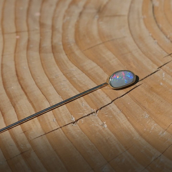 Lightning Ridge opal tie pin, opal is 0.75ct, measures 9x5mm, semi black n6 body tone, 4/5 brightness.