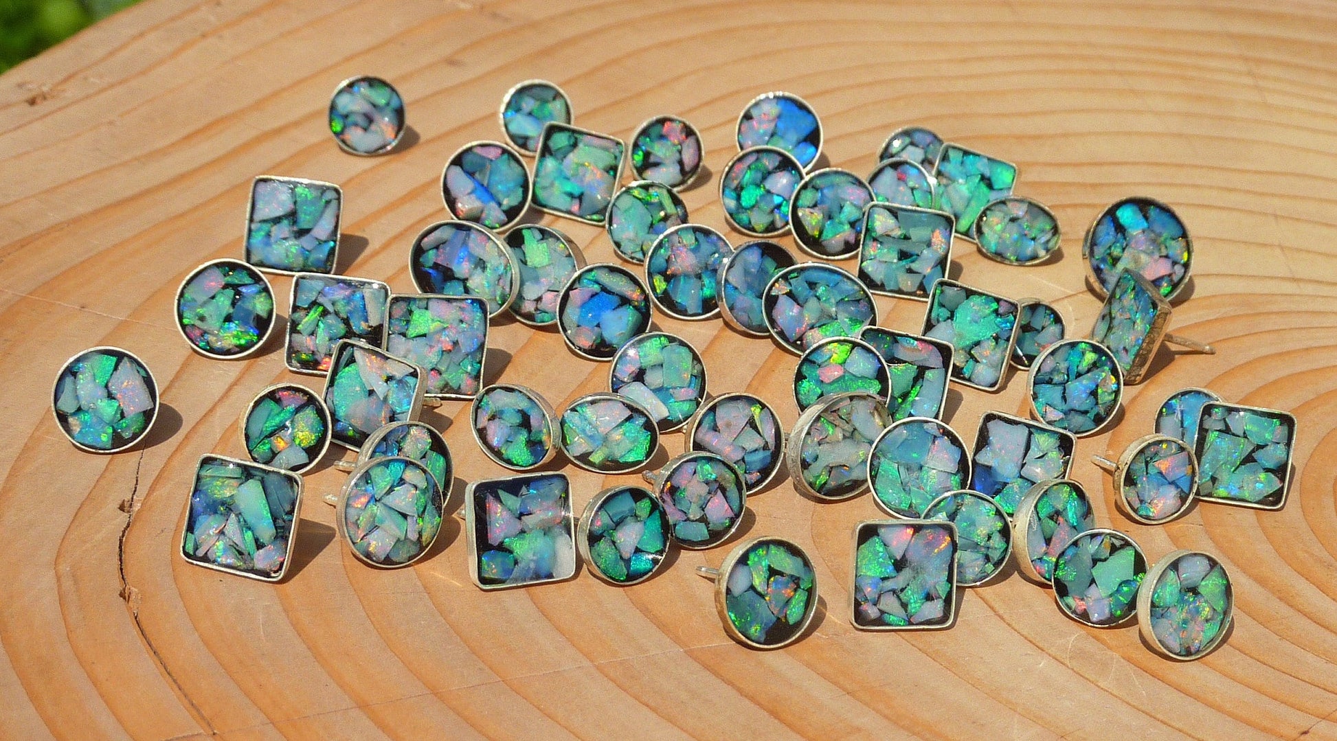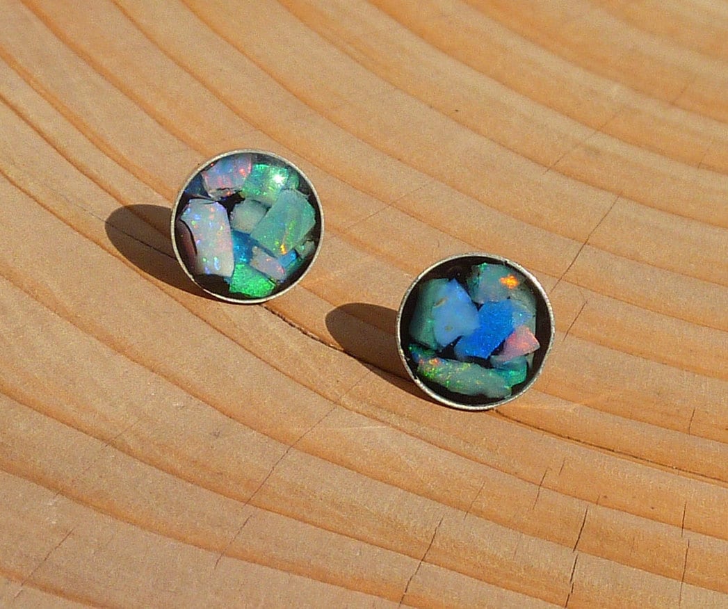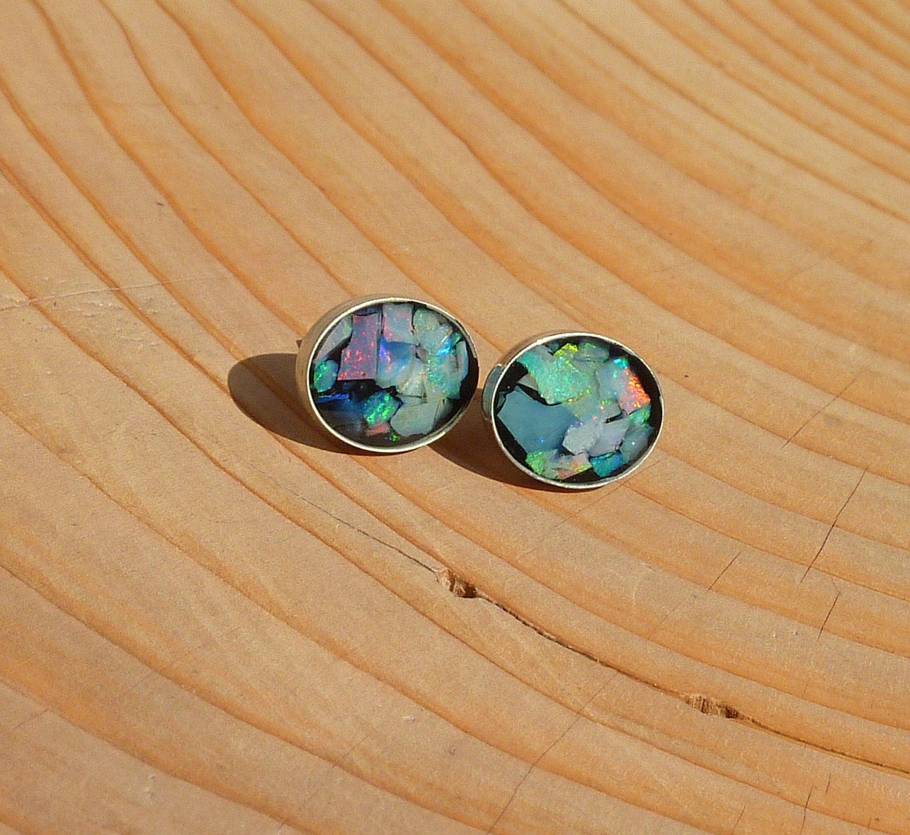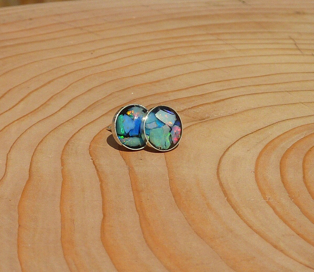 Great care was taken to remove as much sand/inclusion/colourless potch etc from the chips, studs have then been filled at random to give a gorgeous array of colours in each stud.