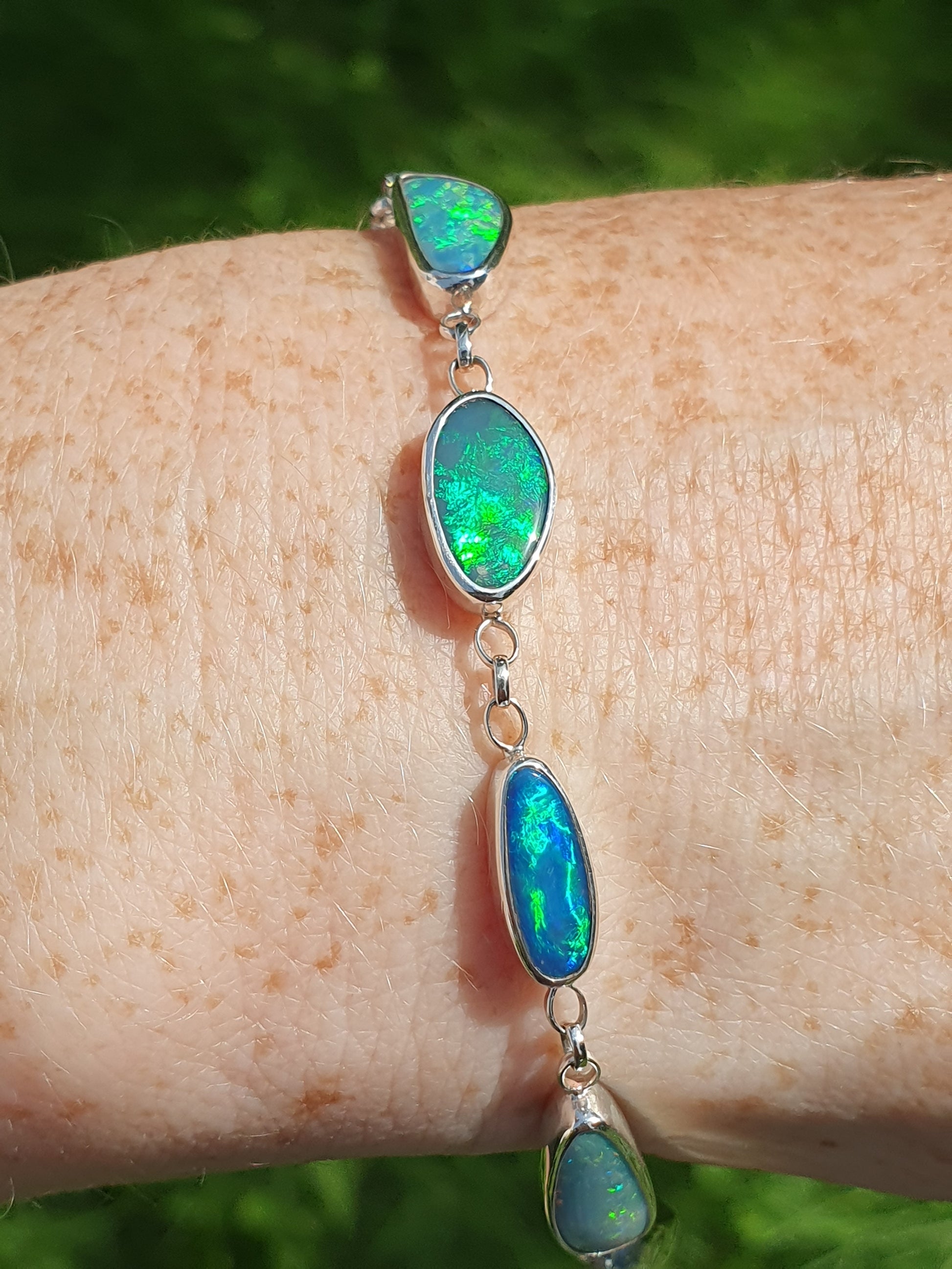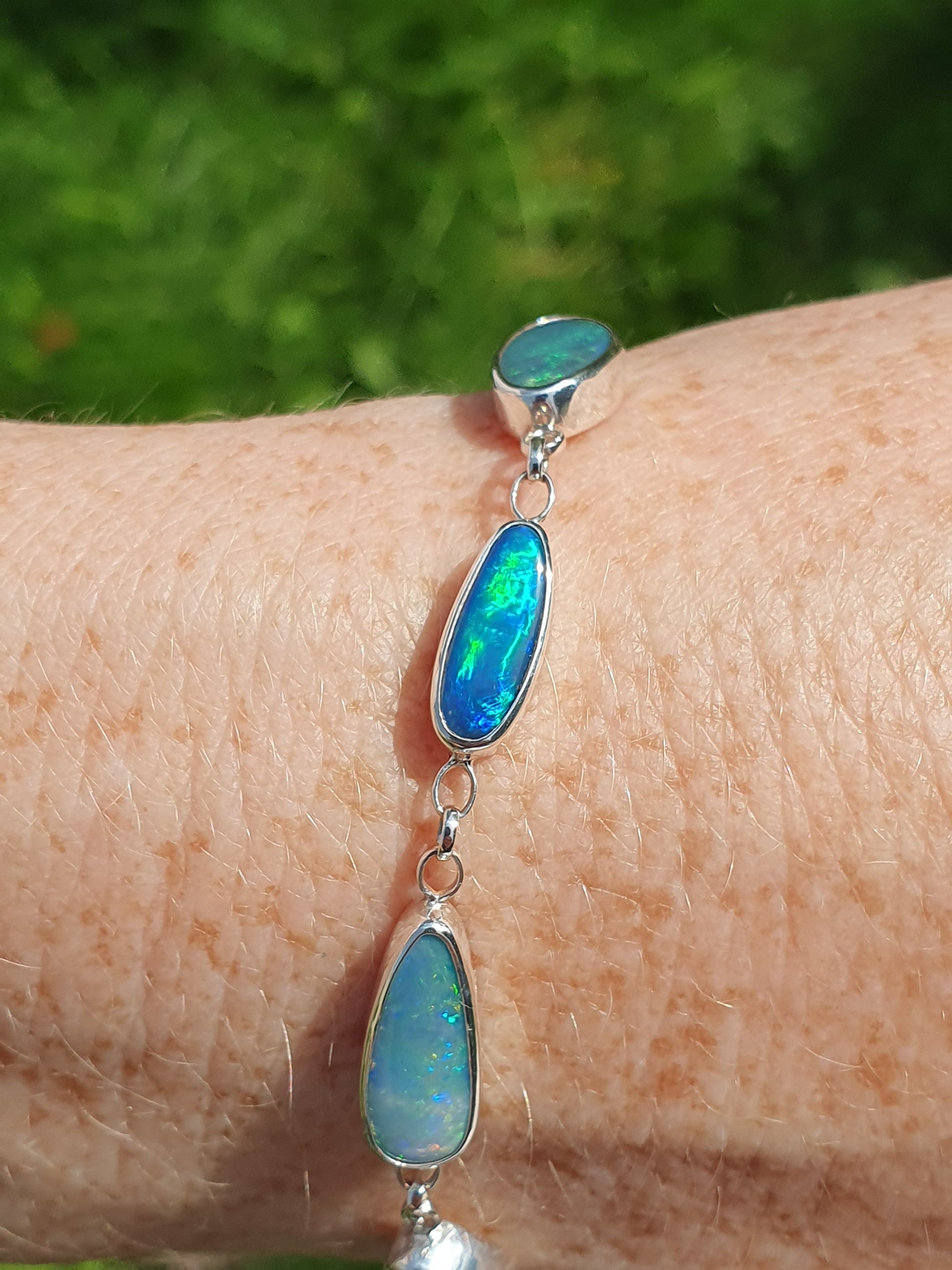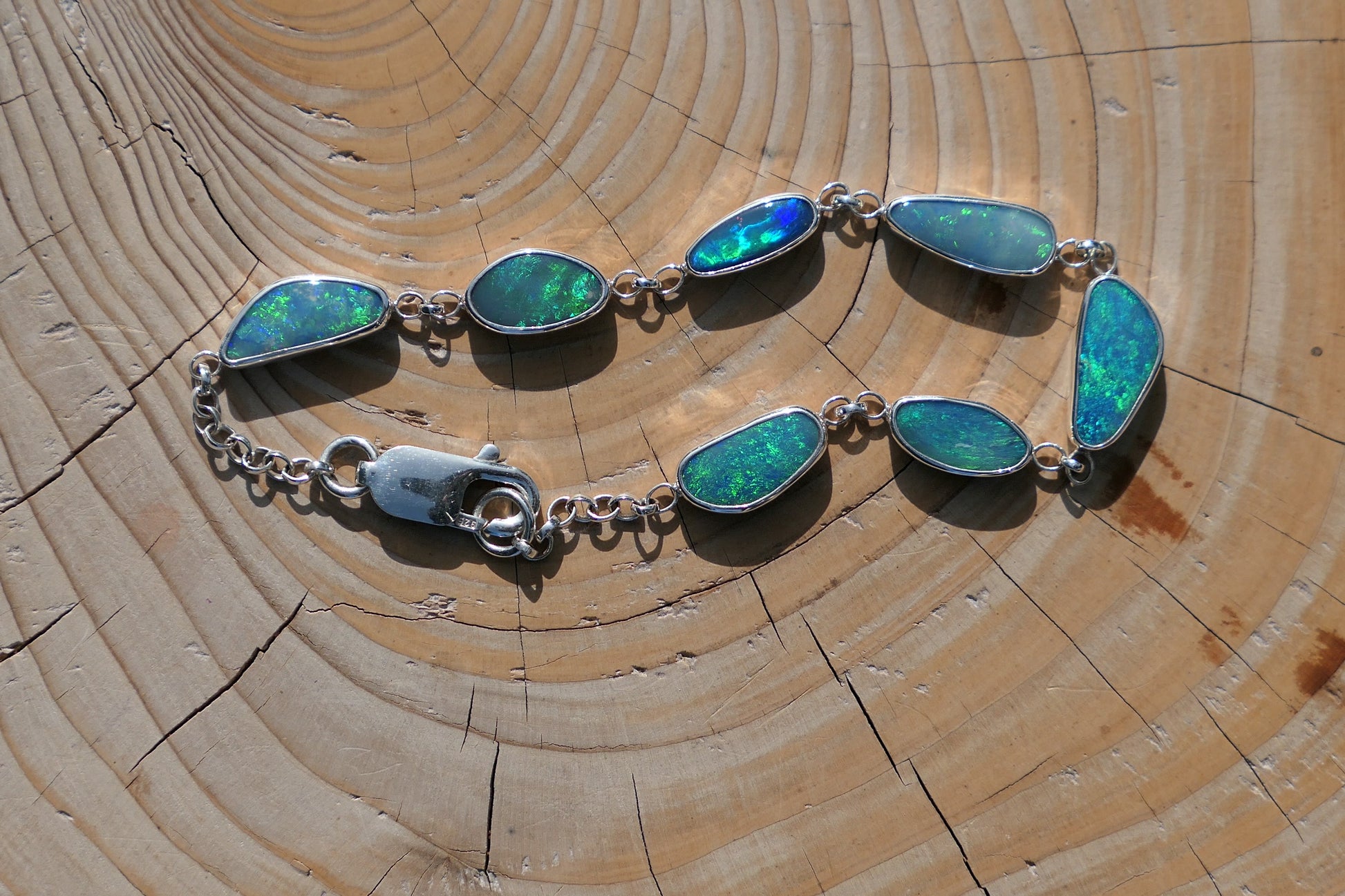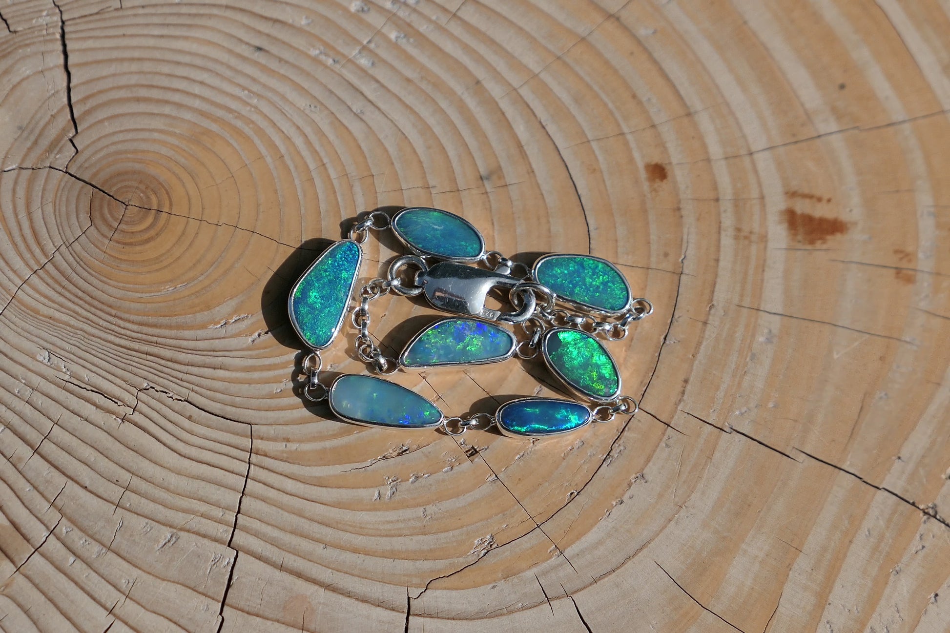 Silver opal bracelet, with 7 Coober Pedy doublet opals.