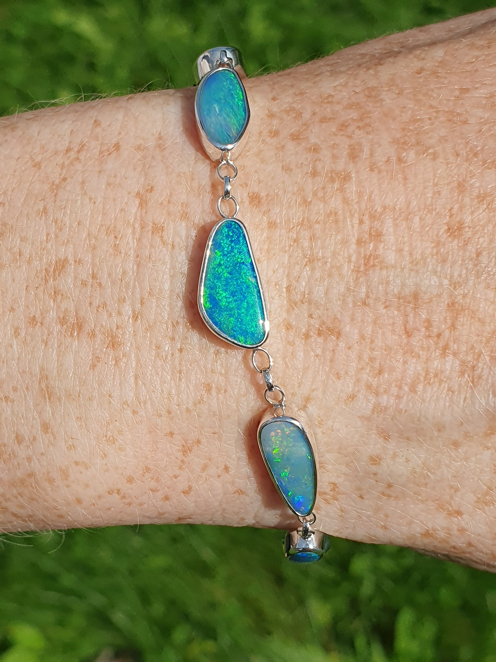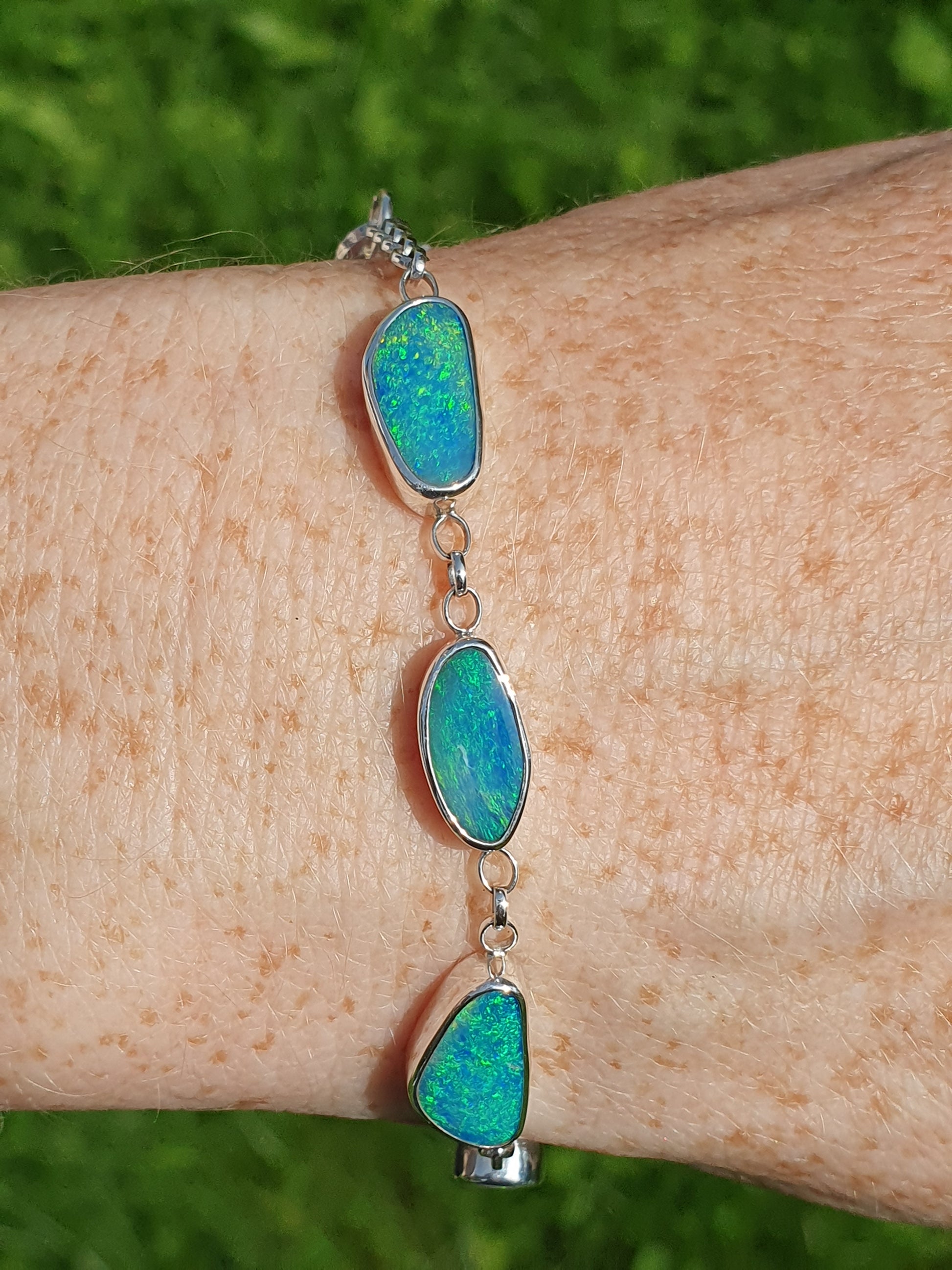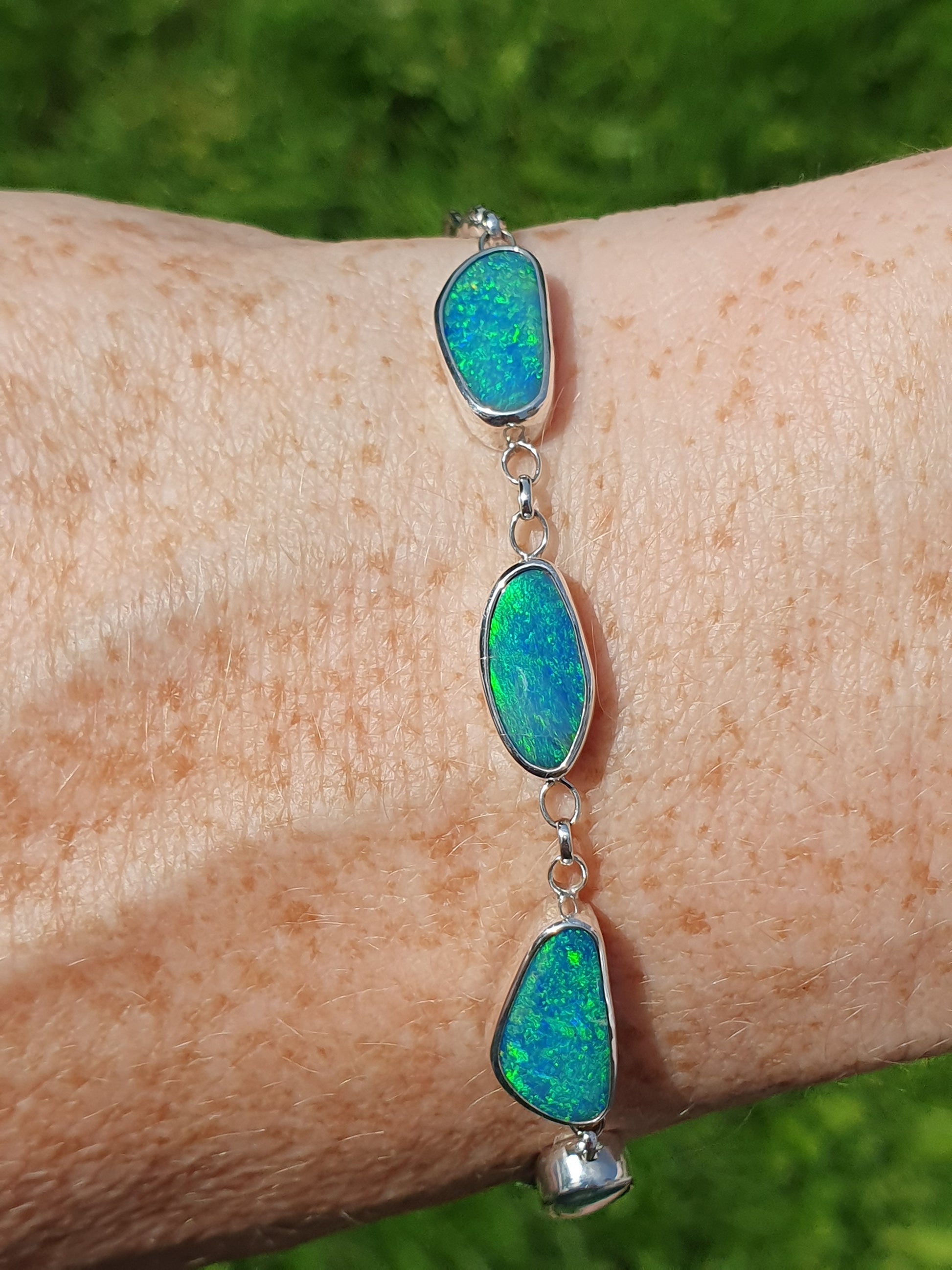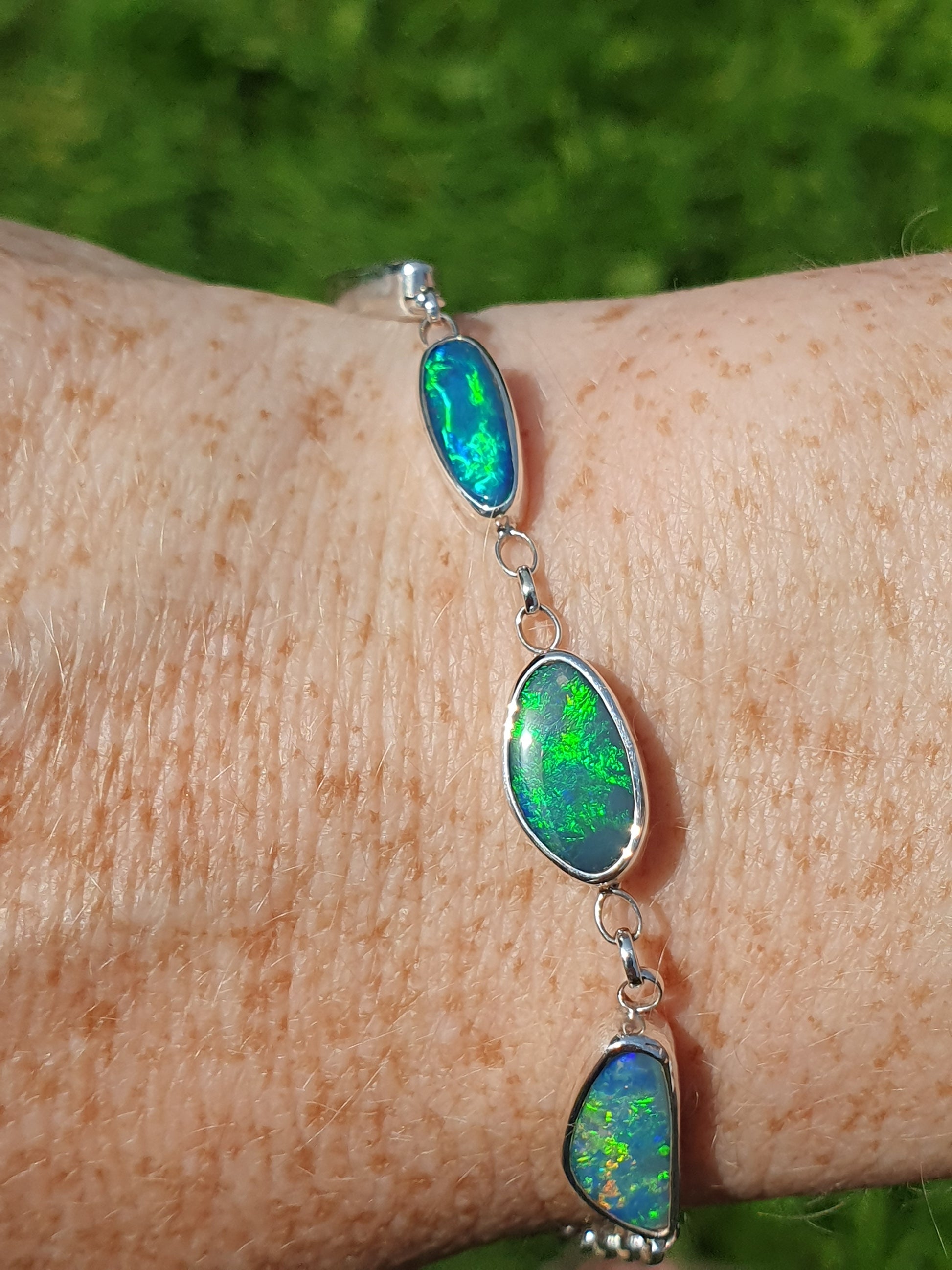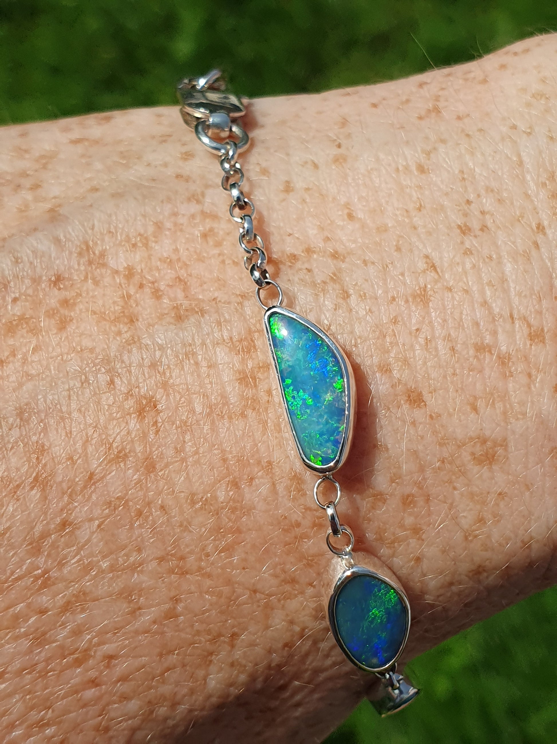 Silver opal bracelet, with 7 Coober Pedy doublet opals.