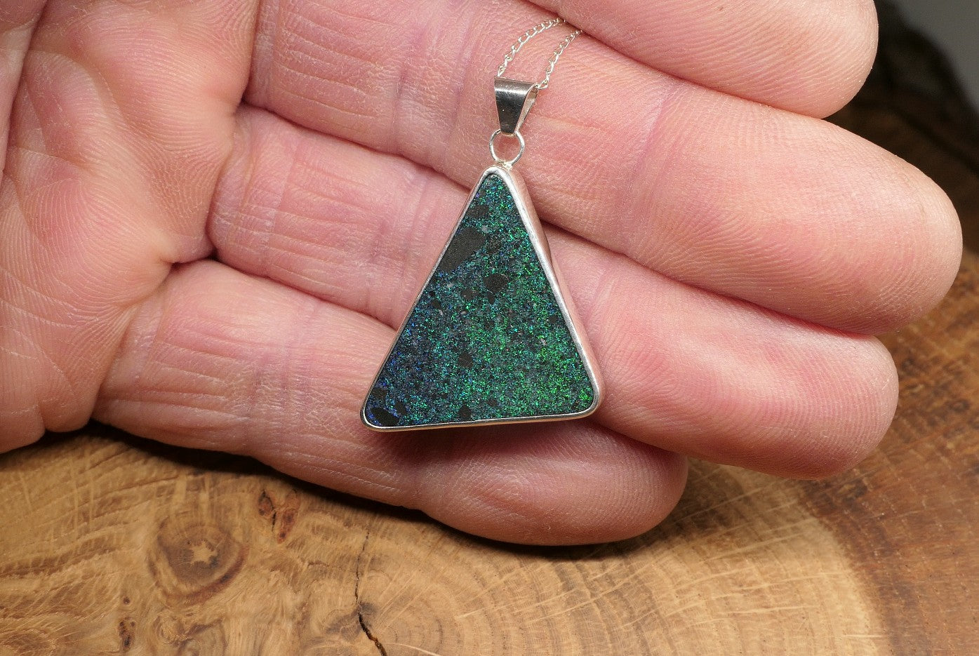 The opal has green and blue pinfire on one side, with bright blue flash/pinfire on the other side.