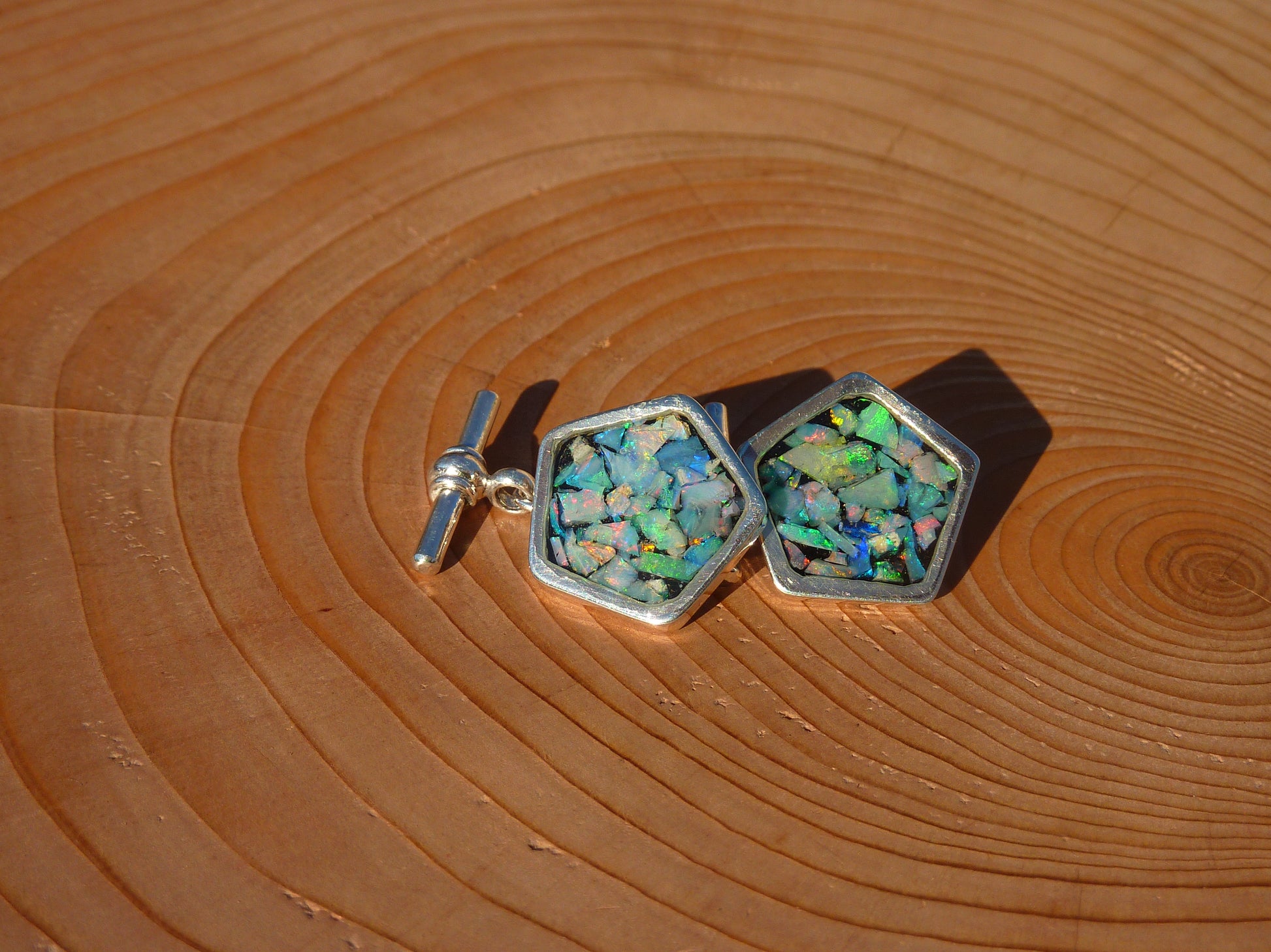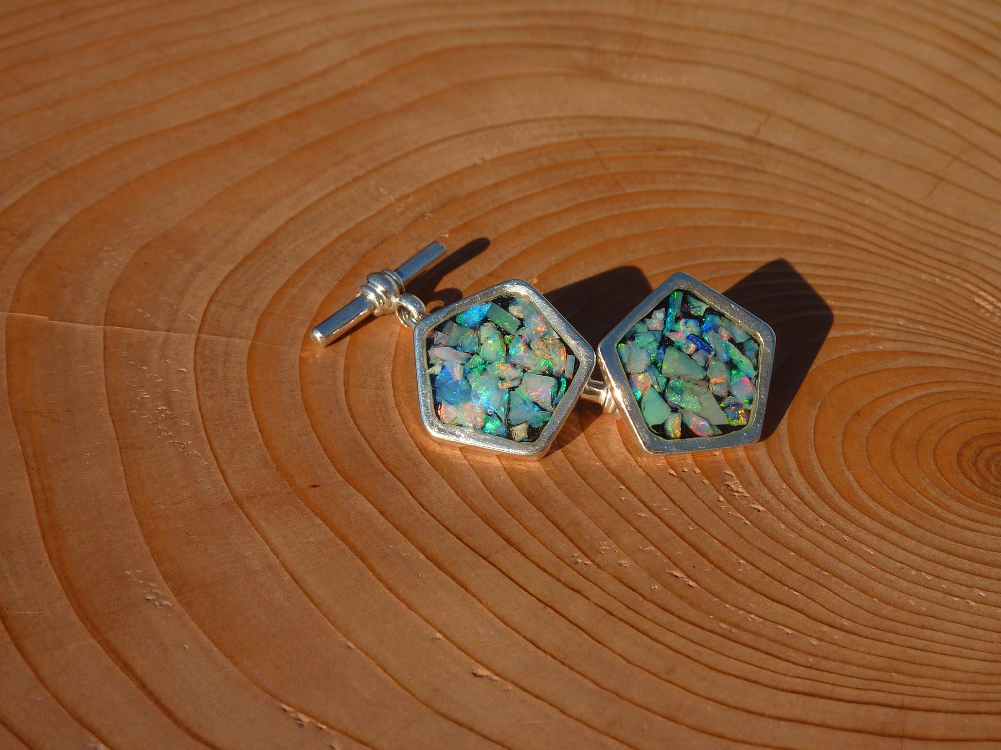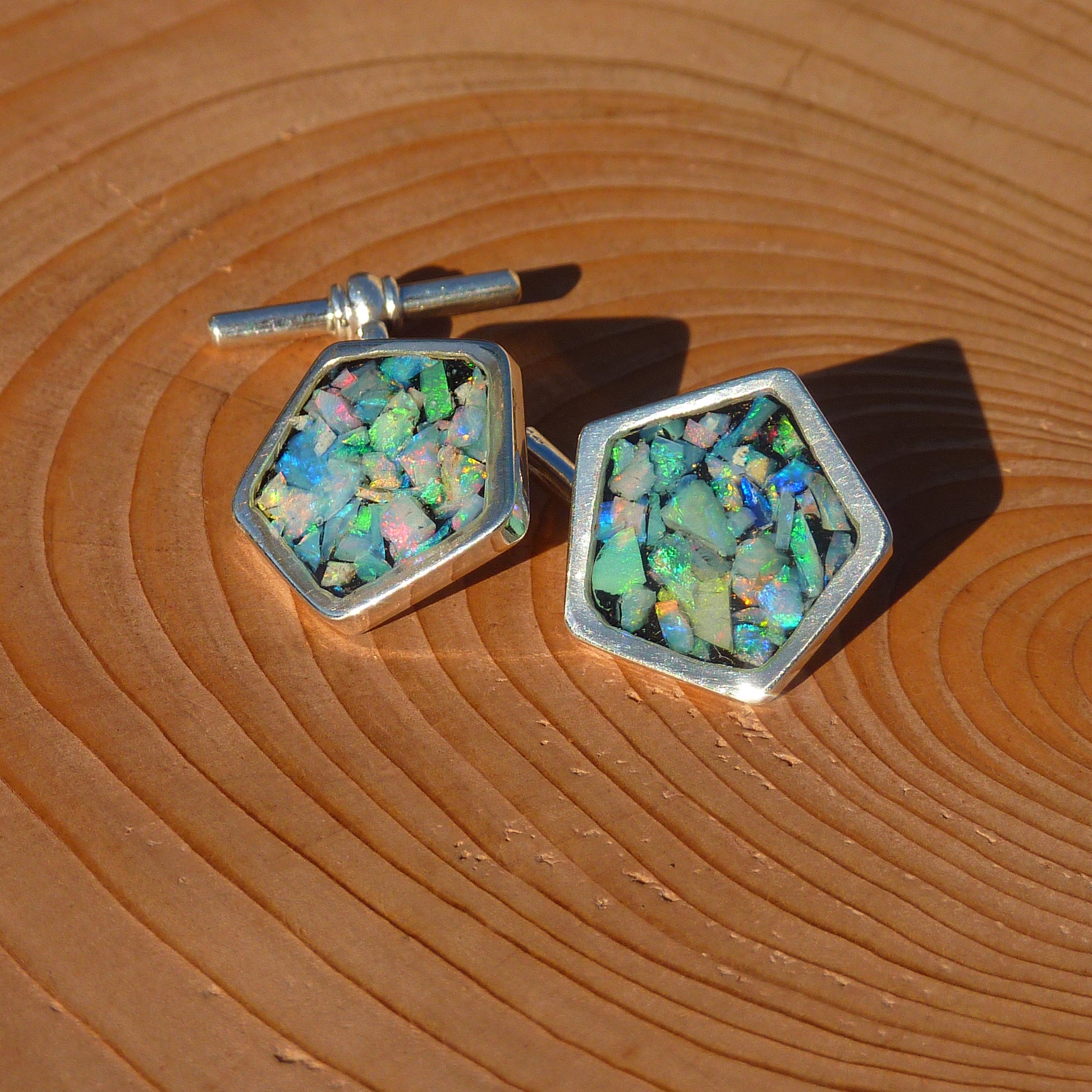 Many colours of the rainbow show in the cufflinks, with the colours constantly changing with any movement.