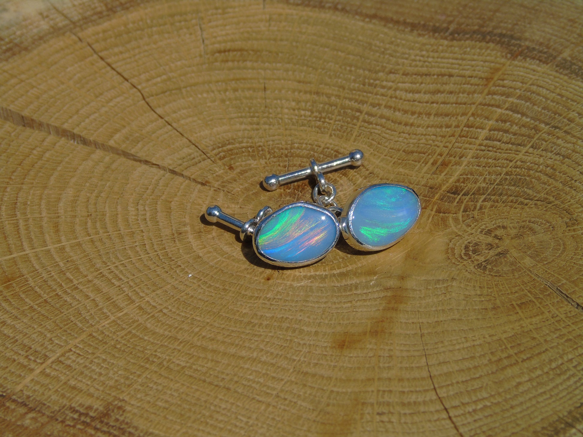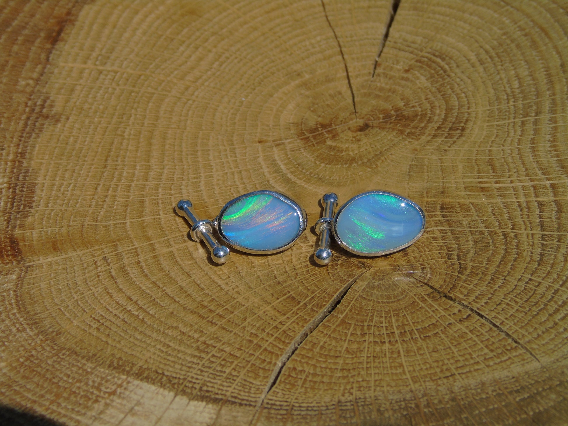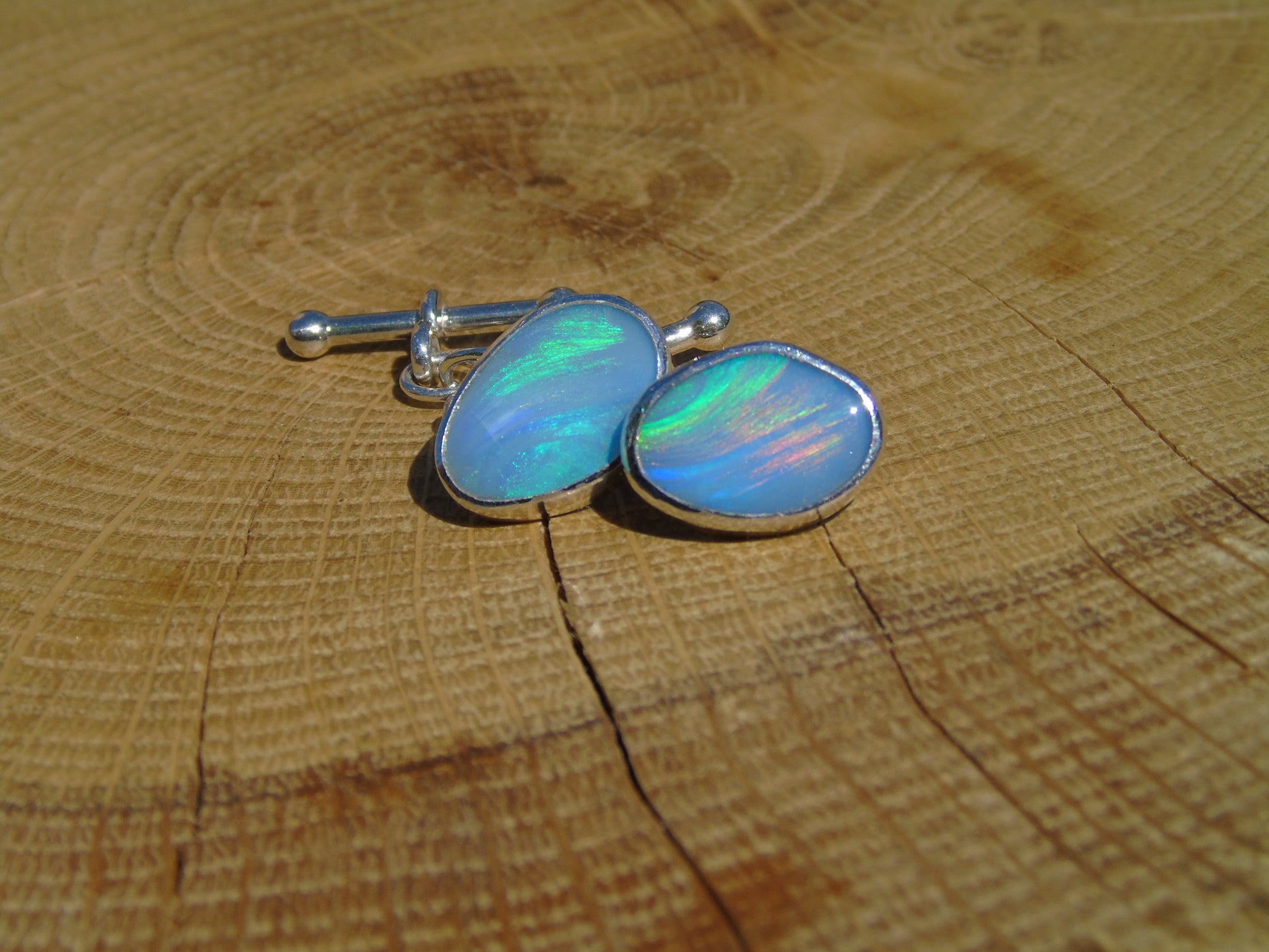 Pair of opal cufflinks with T-bar and chain, the opals are opposite faces of a sliced stone and have bright multicoloured rolling flash in a wave pattern.