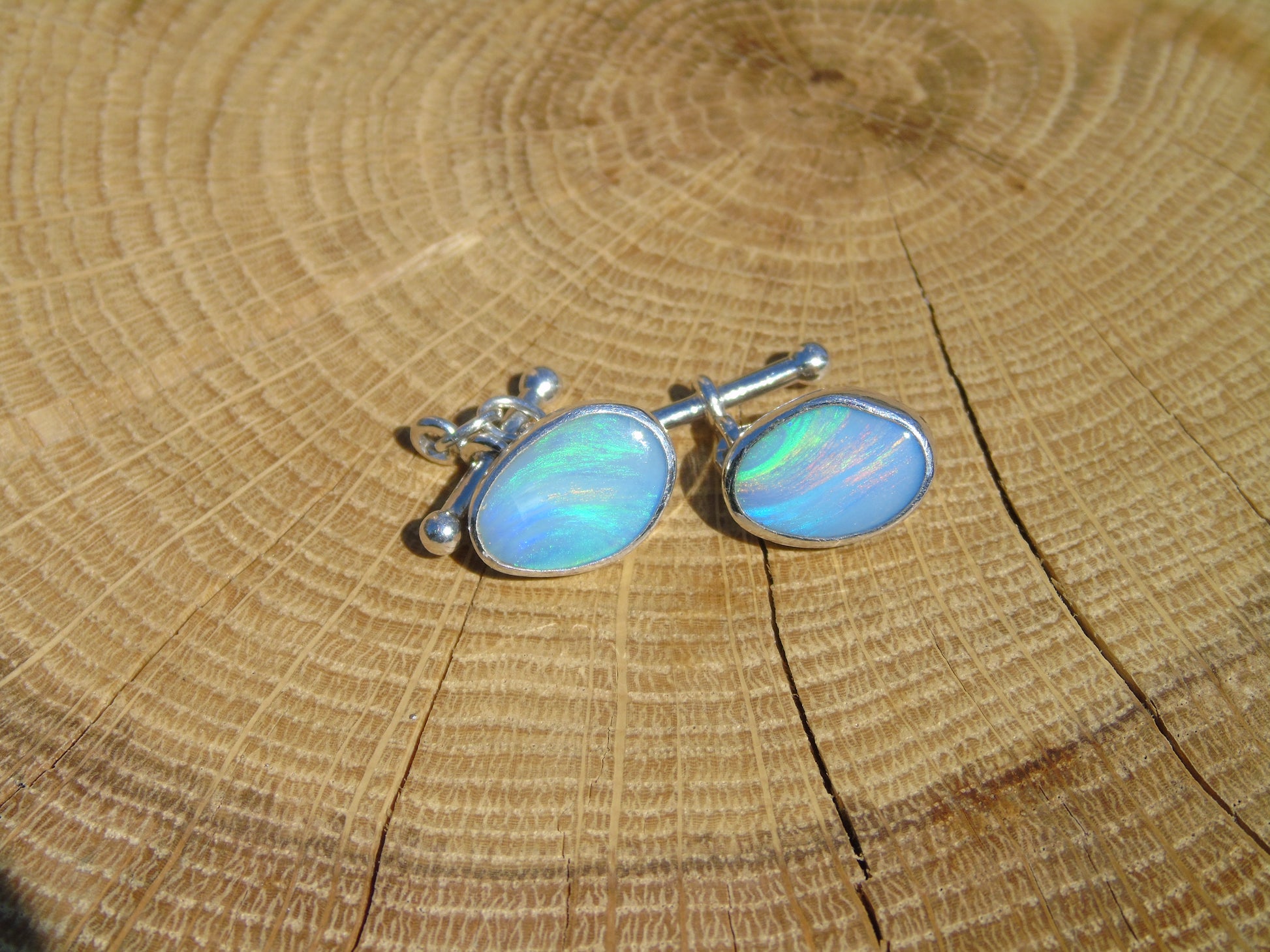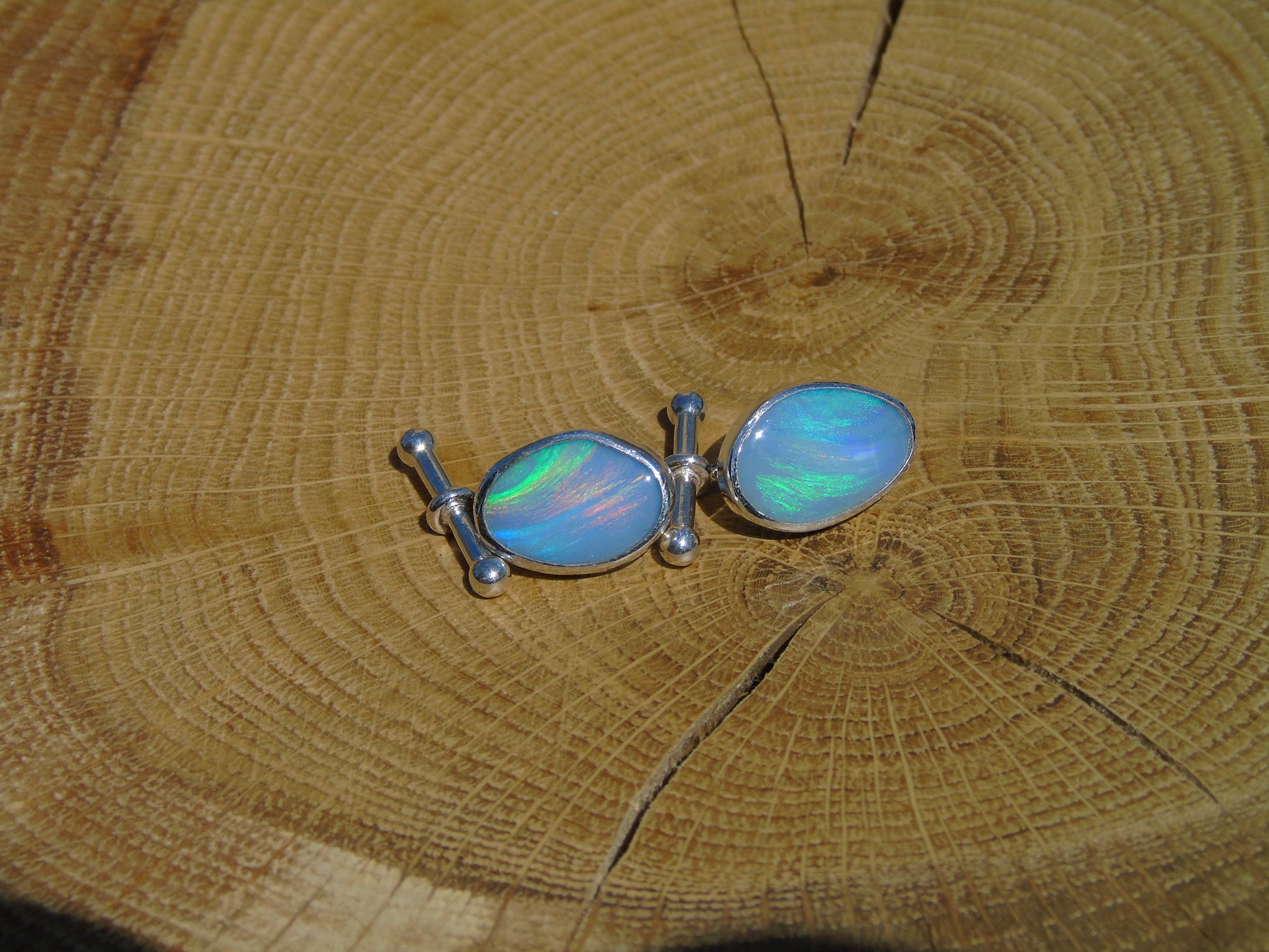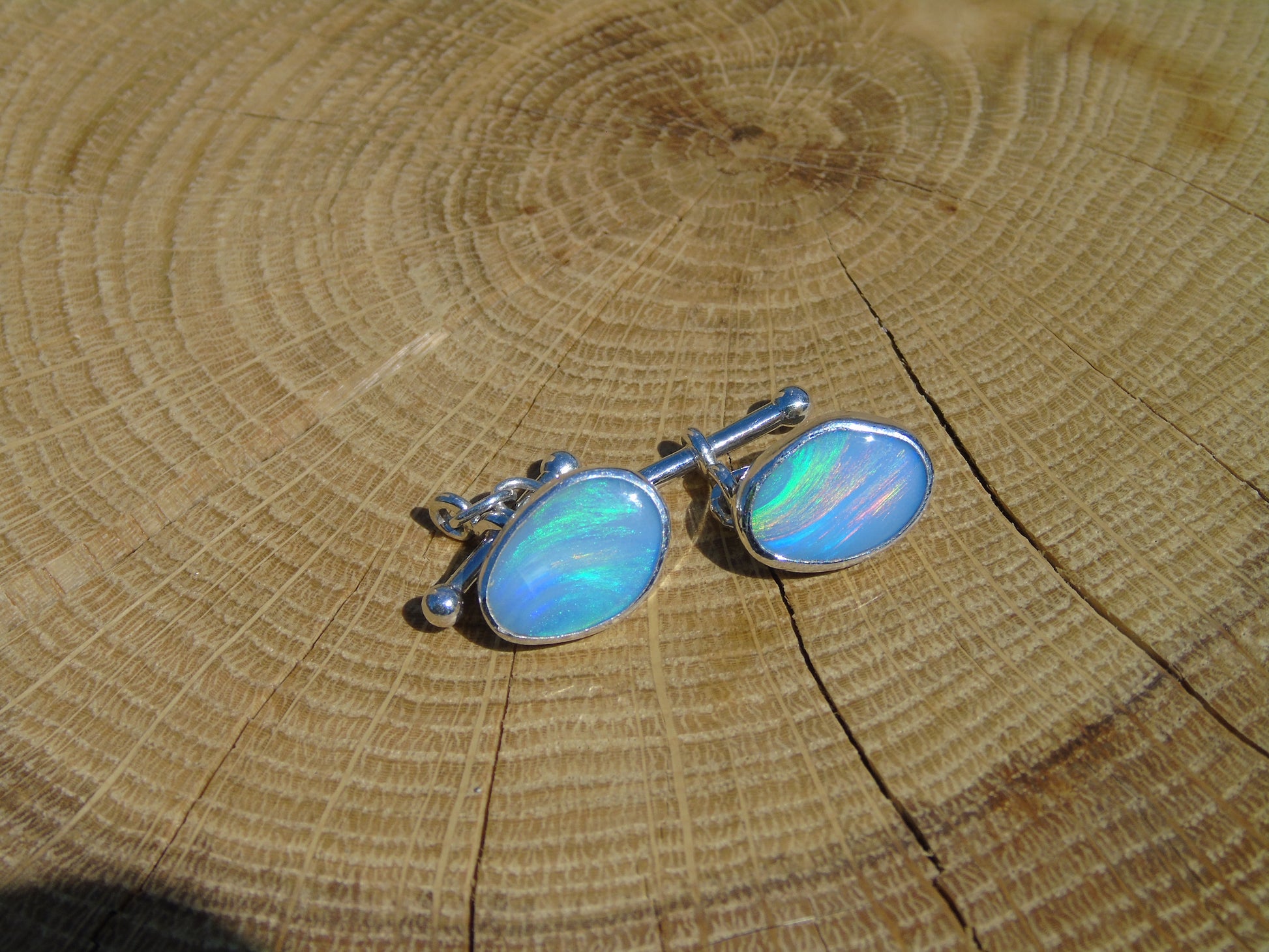 Pair of opal cufflinks with T-bar and chain, the opals are opposite faces of a sliced stone and have bright multicoloured rolling flash in a wave pattern.